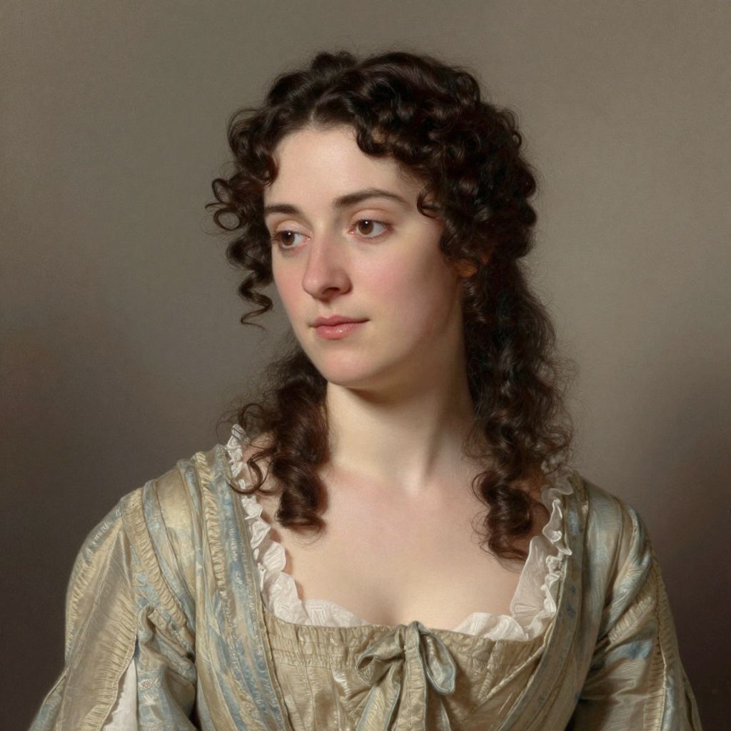 A classical portrait rendered in a realistic style, featuring a woman with dark, curly hair and a soft, contemplative expression, dressed in an 18th-century-inspired gown with delicate ruffles, evoking the timeless elegance and intellectual spirit associated with Mary Wollstonecraft's era.