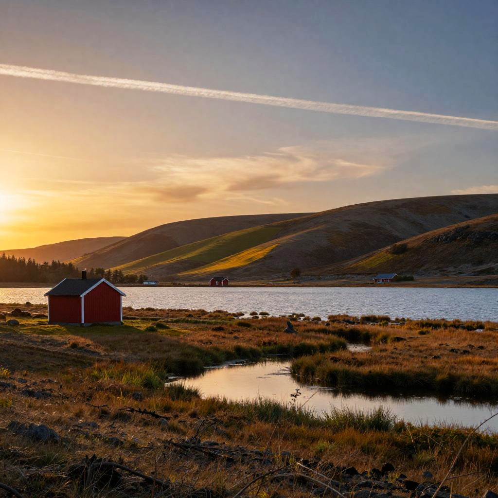 A serene landscape featuring a calm blue lake surrounded by grassy marshland and rolling hills under a warm sunset sky. In the foreground, a small red wooden cabin is positioned near reflective water pools, while additional red buildings are visible near the lake. The sky displays an orange and blue gradient with a bright contrail stretching across. The scene captures peaceful rural nature with soft light and natural colors.