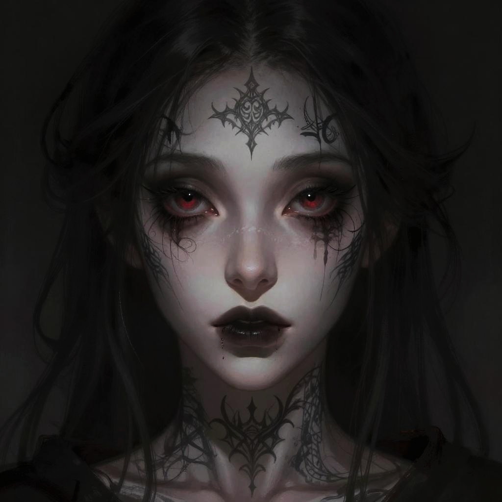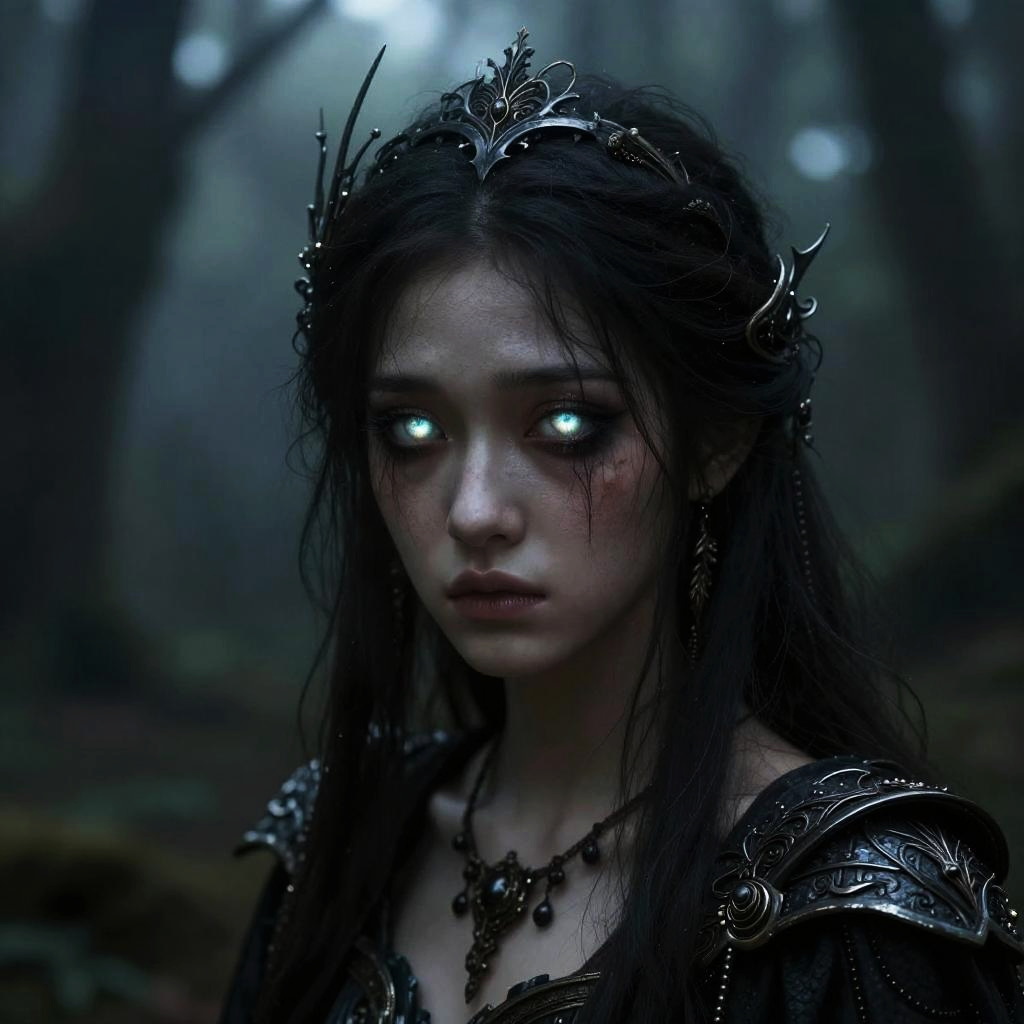 Gloomy eye, fantasy character with glowing yet sorrowful eyes in a dark misty forest, ethereal lighting, intricate details, dark fantasy art