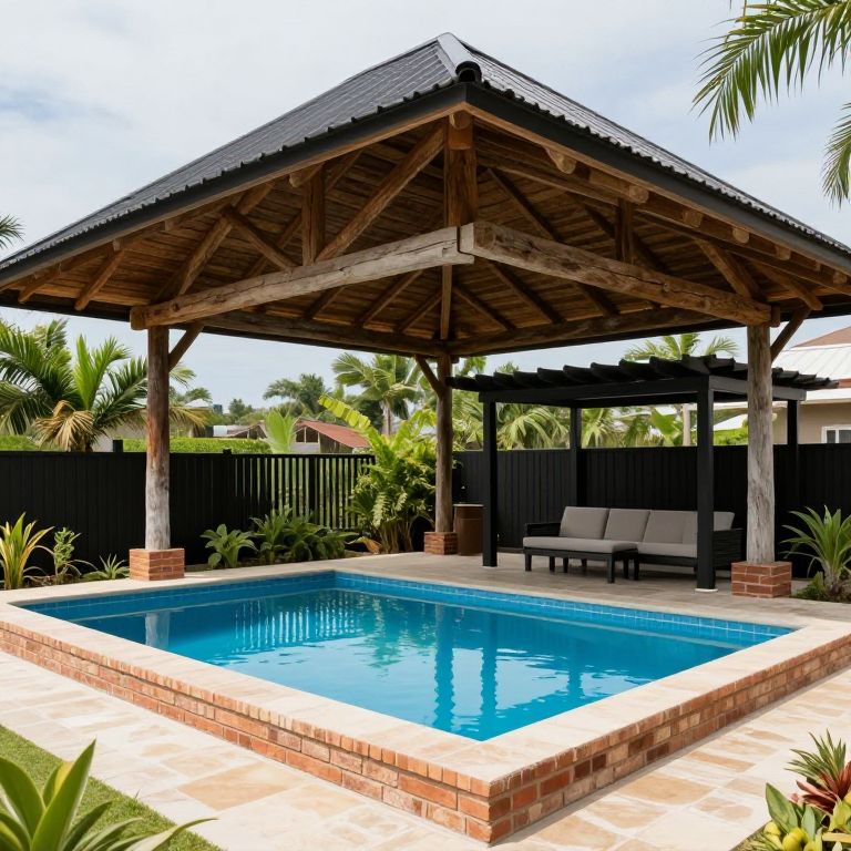 Photograph of a wooden-roofed pool gazebo with blue water, beige tiles, brick borders, black fence, lounge chairs, and tropical plants