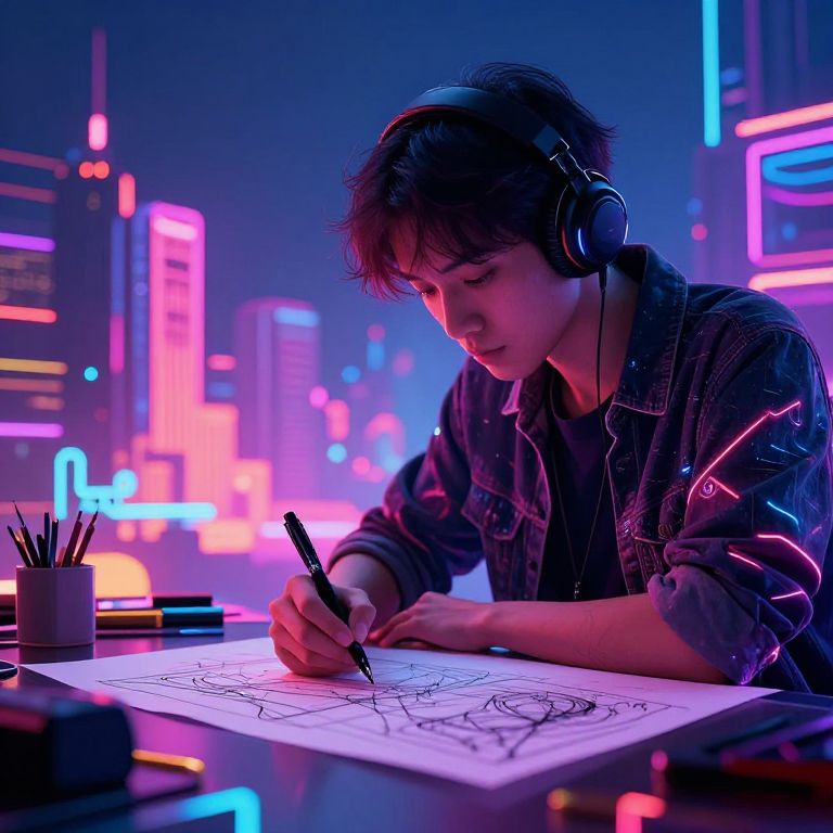 Photograph of a young man with dark hair, wearing headphones and a denim jacket, drawing under neon city lights with a pen.