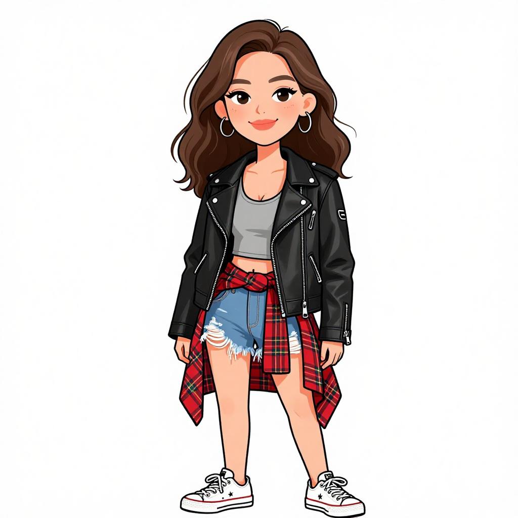 Woman with pretty face and pretty hair. smiling Woman, casual streetwear, fitted denim jacket with a faded wash and distressed detailing, classic point collar, buttoned flap chest pockets, long sleeves with buttoned cuffs, layered over a plaid flannel shirt in blue and orange tones, peeking from under the hem of the jacket, slim-fit black jeans, laced-up black leather ankle boots with a glossy finish --sref 1467