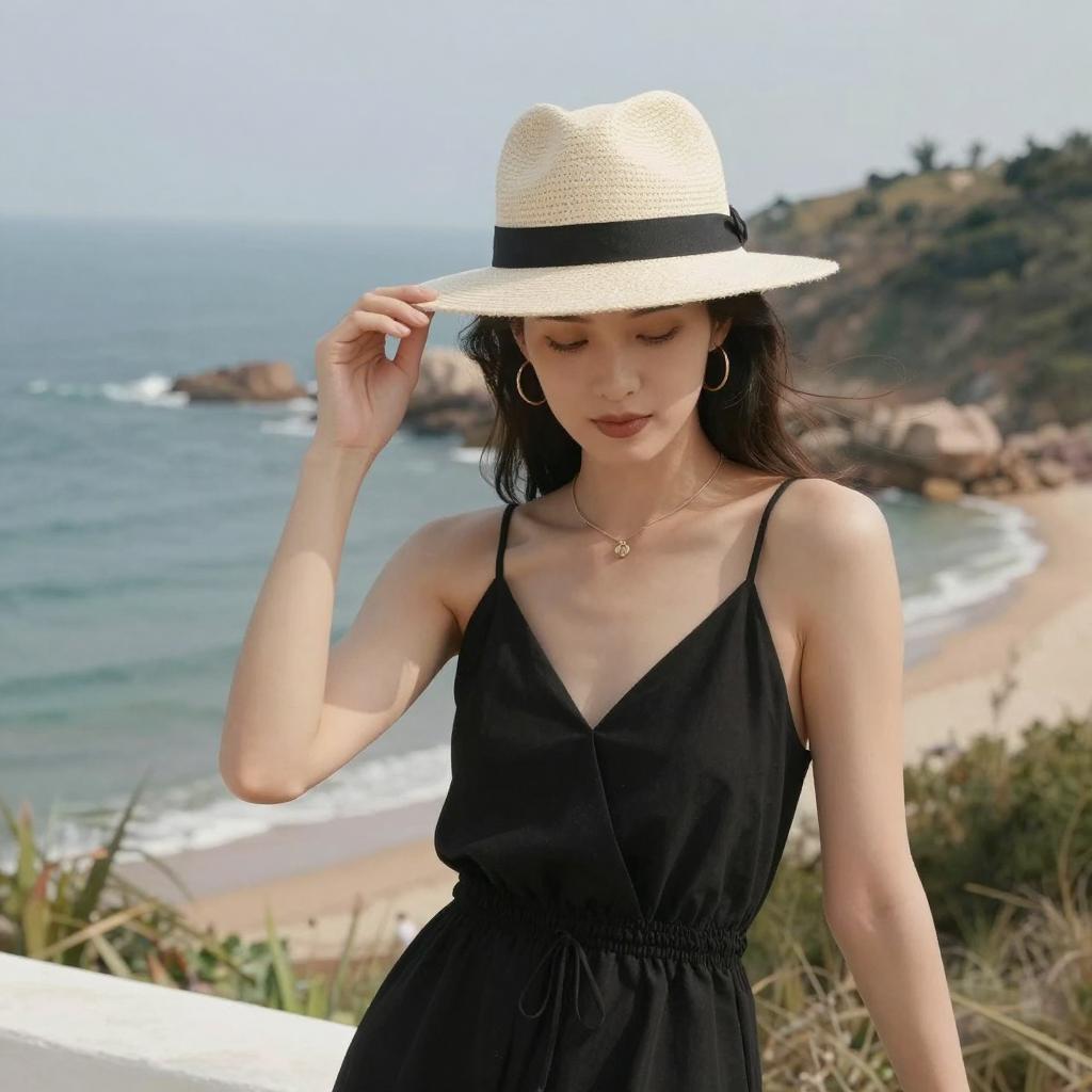 A young Asian woman wearing a black V-neck dress and a beige Panama hat with a black band poses near a coastal area. She accessorizes with gold hoop earrings and a delicate gold necklace. The background features a sandy beach, ocean waves, and rocky hills under a clear sky, conveying a relaxed summer vibe.