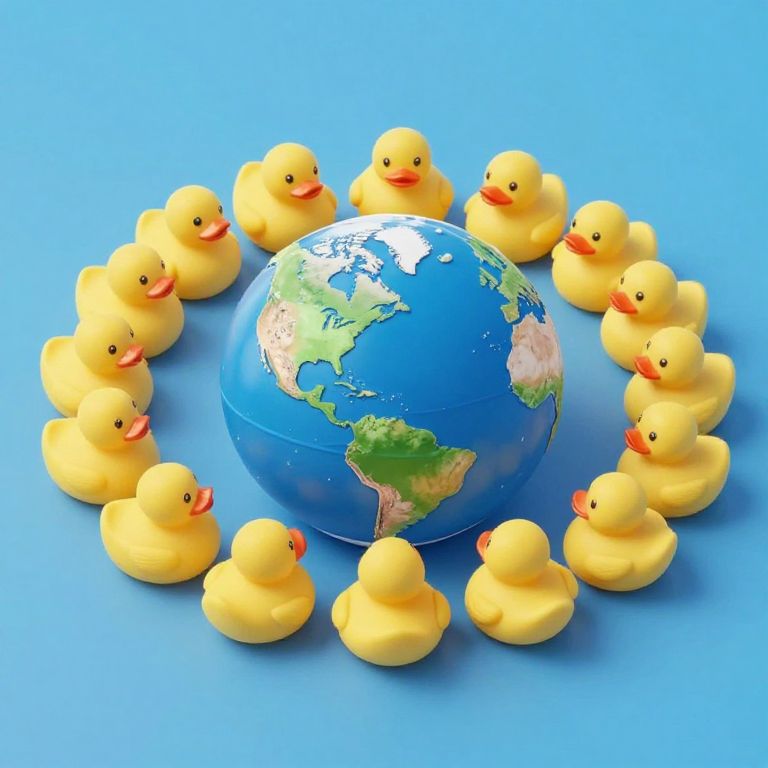 Rubber ducks line the equator of Earth in synchronized orbit, their squeaks forming an ancient forgotten melody that only AI can decode.