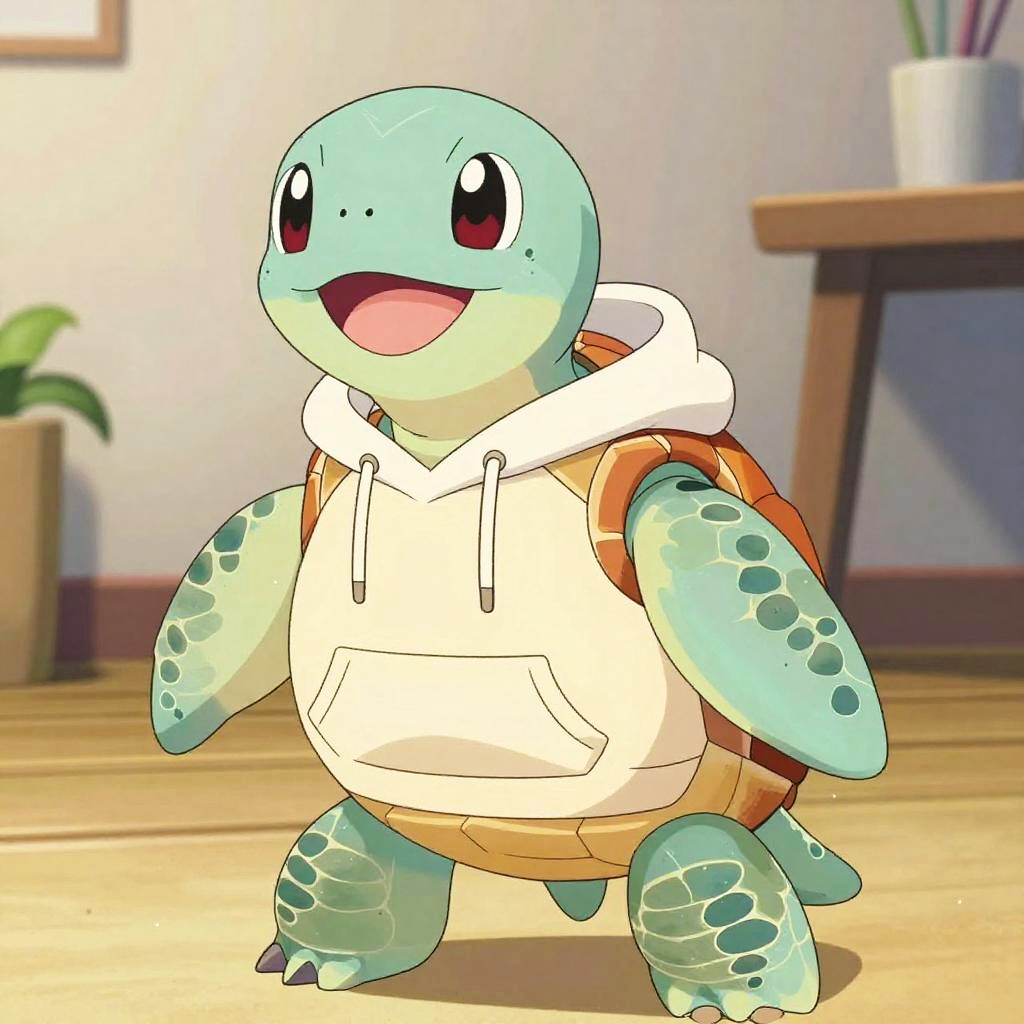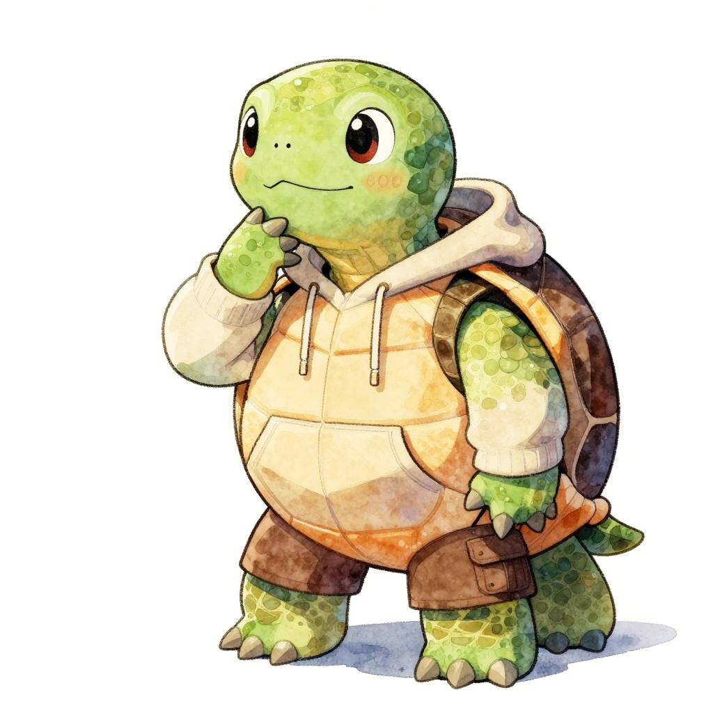 Close-up shot of a thoughtful male turtle, dressed as a high schooler, in watercolor painting style, wearing a cozy hoodie and cargo shorts, cozy lighting, vibrant and charming character design