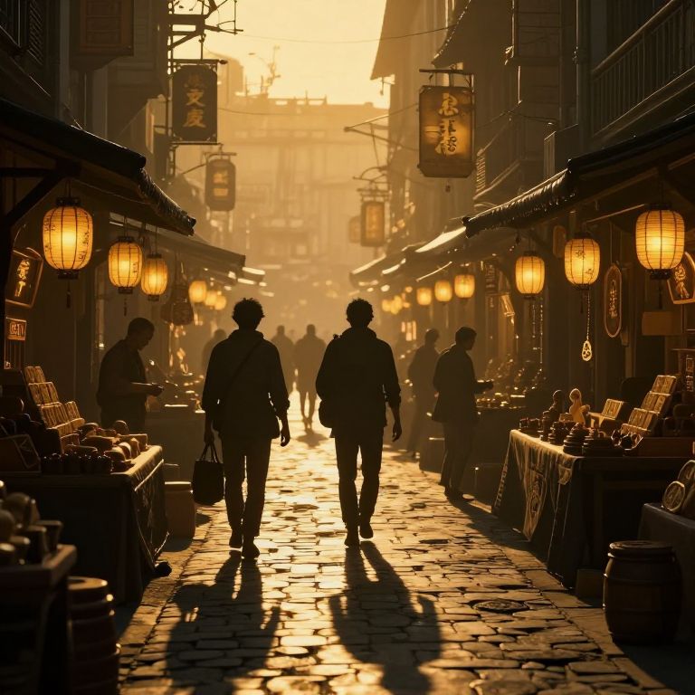 In a cyberpunk-inspired marketplace bathed in golden-hour lighting, silhouetted figures navigate a cobblestone street adorned with traditional lanterns, their shadows symbolizing the intangible currency of memories, abilities, and emotions exchanged in this enigmatic setting.