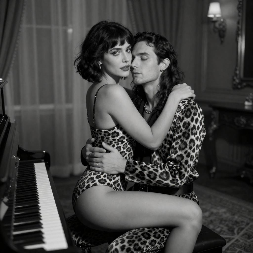 Black-and-white photograph of a woman with short, dark hair, wearing a leopard-print bodysuit, sitting on a lit piano. She embraces a man with long hair, also in a leopard-print outfit, who is seated behind her. They are in a dimly lit, elegant room with draped curtains and wooden furniture in the background.