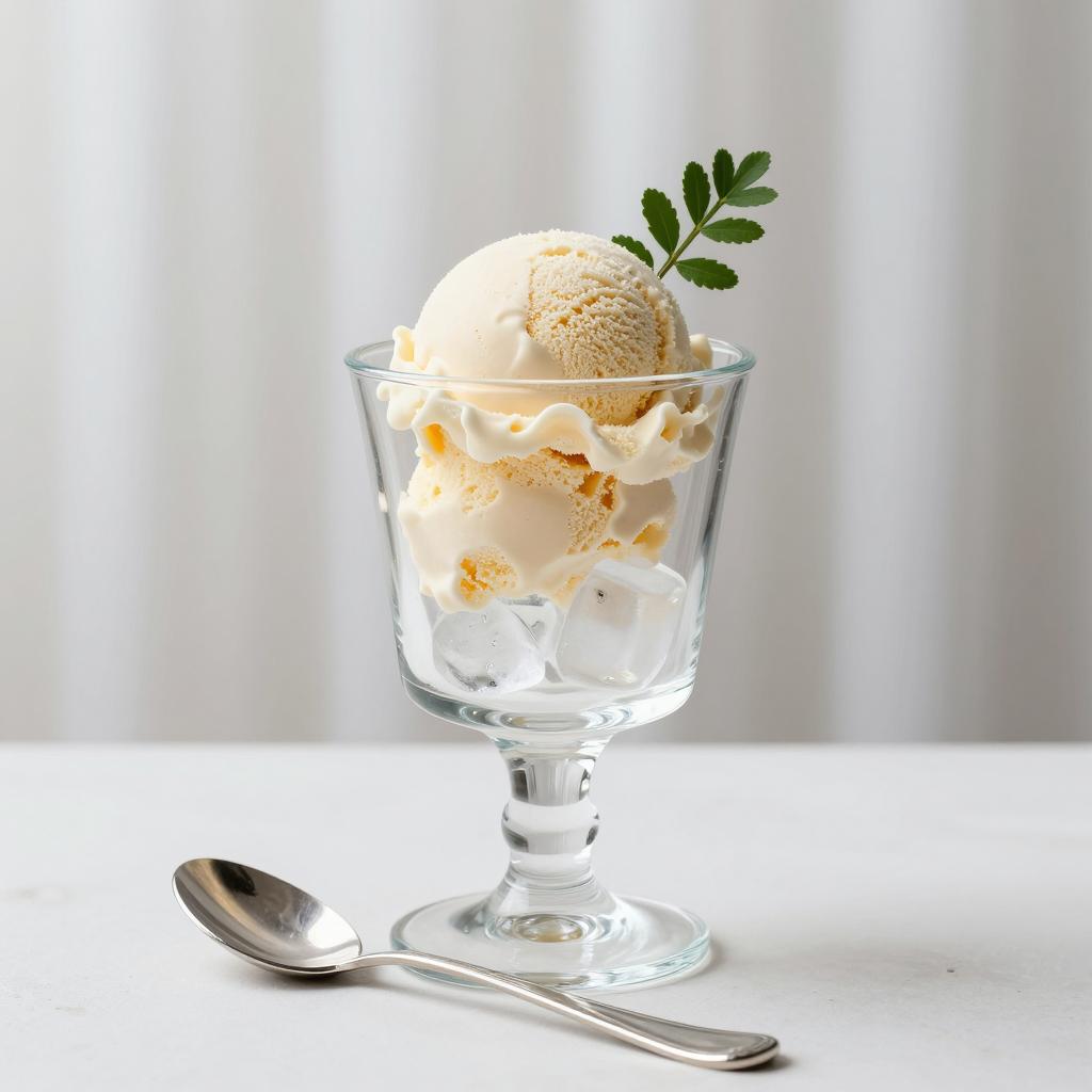 Clear glass goblet with ice cubes, topped with a scoop of beige ice cream and a small green leaf. Silver spoon on a white surface in front of the goblet. Background: white ured curtain.