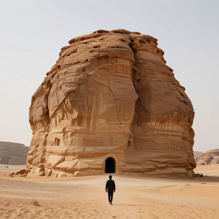 A solitary figure walks toward a colossal, otherworldly rock formation that looms like a sentinel over a desolate desert landscape, its base concealing a mysterious arched entrance that defies natural explanation.
