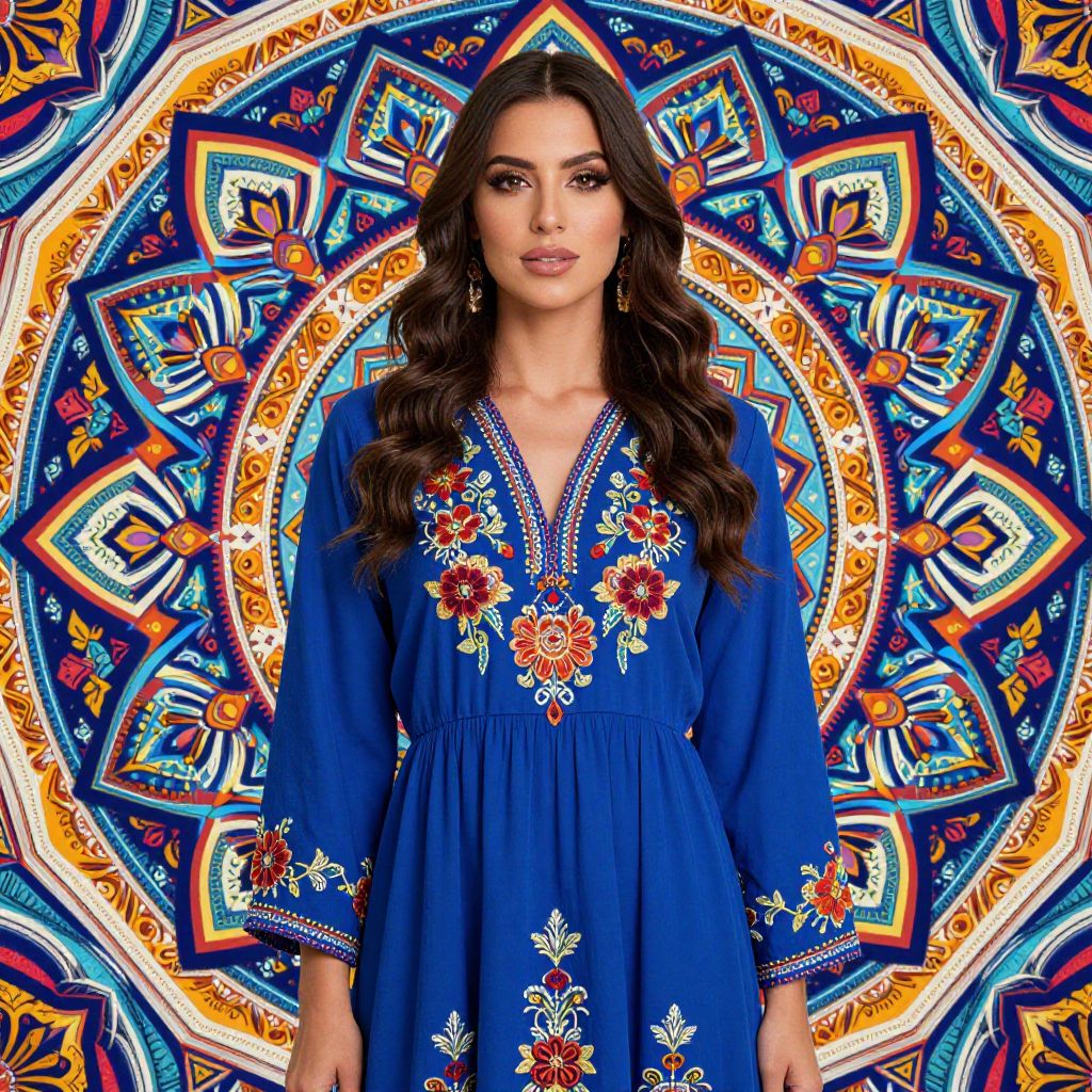 Photograph of a young woman with long, wavy dark brown hair and fair skin, wearing a vibrant blue, embroidered dress with floral patterns in red, orange, and white. She has red and blue dangling earrings. The background features a colorful, symmetrical mandala design with blue, red, orange, and white geometric patterns, creating a vivid, bohemian aesthetic. The woman stands centered, looking directly at the camera with a neutral expression. The image exudes a cultural, artistic vibe with rich, saturated colors and intricate details.