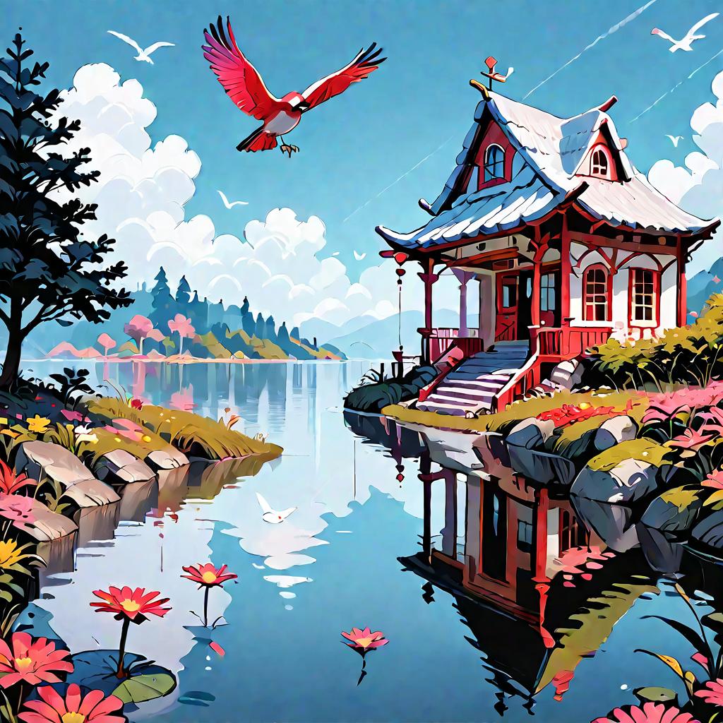Score_9, score_8_up, score_7_up, score_6_up, source anime, no humans, scenery, cute anime landscape, in the middle of a lake, house, birds