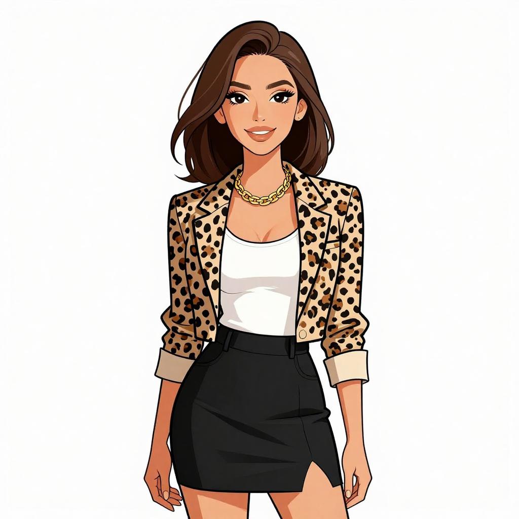 Woman with pretty face and pretty hair. smiling Woman, edgy, herringbone-patterned grey cropped blazer, asymmetrical zipper, notch lapel, black strappy bodysuit, high-waisted black faux leather shorts, natural makeup, tousled hair. --sref 1467