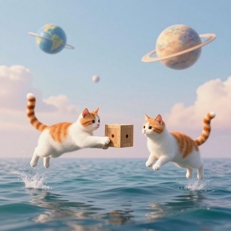 A whimsical orange-and-white cat with seven serpentine tails floats gracefully above a serene ocean, mediating a cosmic standoff between a cube-shaped wooden box and a ringed planet, all set against a dreamy sky dotted with miniature worlds.