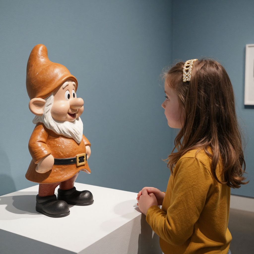 Photograph of a young girl in a yellow shirt and headband, smiling at a detailed, brown gnome sculpture on a white pedestal.