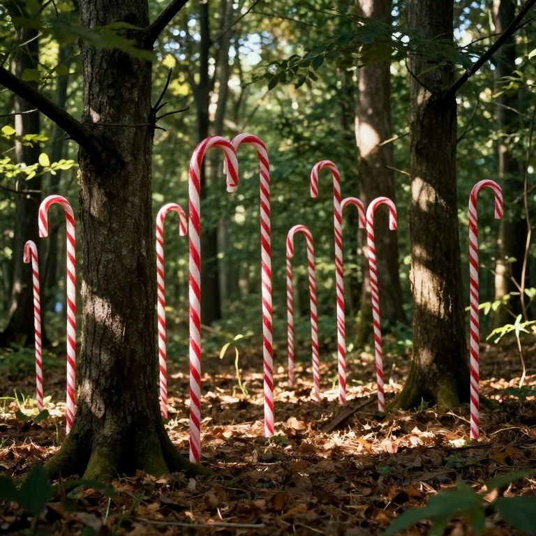 Photograph of a forest with sunlight filtering through trees, illuminating numerous red and white striped candy canes standing upright on the forest floor.