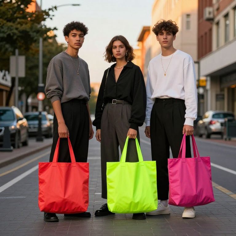 Street chic aesthetics in a vibrant urban setting, featuring bold neon accents, oversized tote bags, and minimalist streetwear fused with artisanal details, captured in golden hour light with a cinematic wide-angle lens.