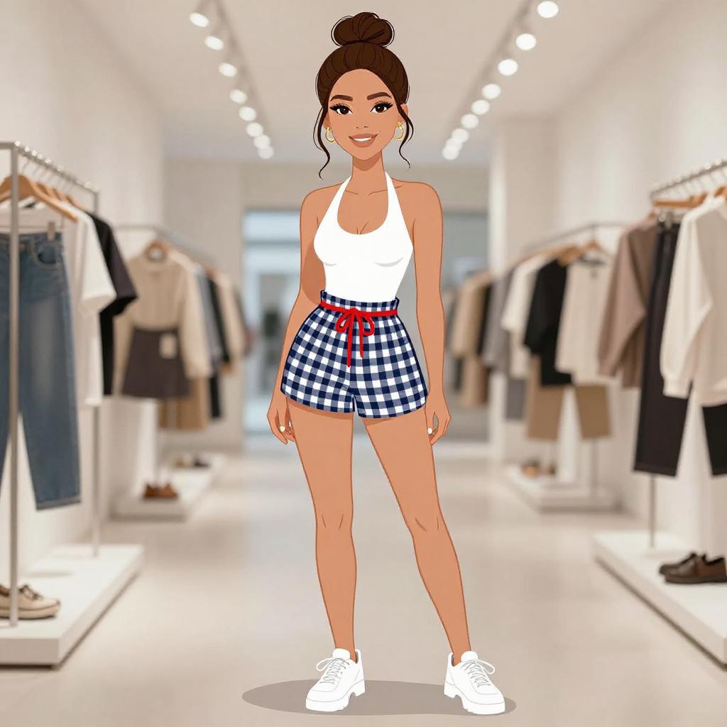 Digital illustration of a smiling woman with medium tan skin, dark brown hair in a bun, wearing a white sleeveless top, blue and white checkered high-waisted shorts with a red ribbon, and white sneakers. She stands in a bright, modern clothing store with white walls and ceiling lights, surrounded by neatly hung clothes on both sides. The background features blurred racks of various garments, including shirts and pants. The overall style is clean and contemporary.