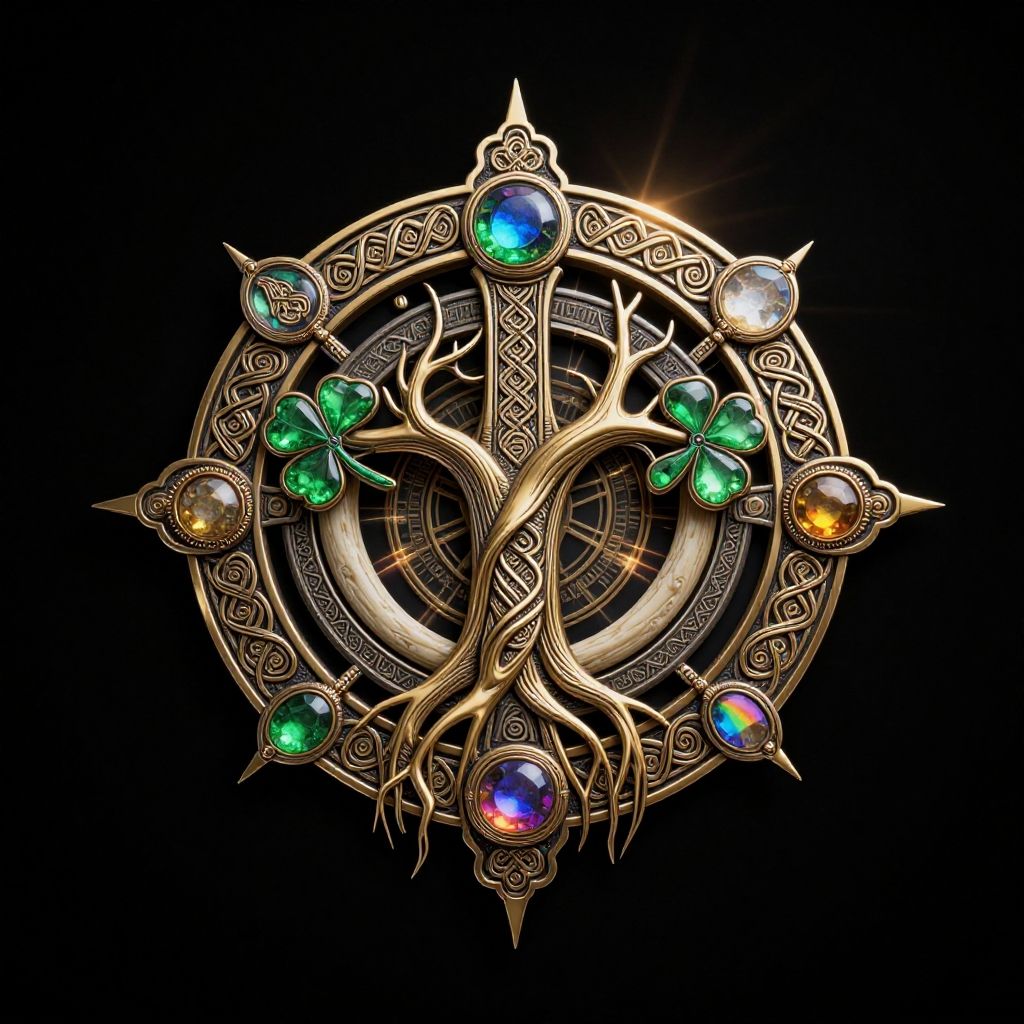 (Professional logo photograph, Ancient ornaments excavated, magical artifact, Innovative logo design, (colorful logo, gemstone design style, Antique design style:1.2), (Celtic cross, Celtic stone, Celtic knots, Celtic spiral patterns, Shamrock), [twisting ancient life big tree roots:0.9], Fine engraving, ancient tattoo, amulet, charm, bone, Love and Peace, life, supernatural, Irish, heliocentrism, Druidism, Ancient megalithic civilizations, minimalism, modern, elegance, avant-garde, fashionable, futuristic, majestic, aesthetic, abstract, beautiful, vibrant colors and jewels in green, gold, Antique Gold, Antique Wire, SchalenBlende, halcyon, (gemstone), rainbow color, transparent, ornaments, (metallic:1.5), [(details:1.2): [ (many small details:1.3) : [ (many ultrasmall details: 1.2):(very detailed ultrasmall edges and microrelief:1.5):0.7 ]: 0.4 ] :0.2], shiny, sparkling, realistic lighting, Enhanced Lighting Effects, rays, god rays, soft shadows, LUT, cinematic, film grain, simple background, black background, amazing quality, best quality, high quality, 4K, 8K, 16K, UHD, absurdres, highres, intricate, Extremely Detailed, (photorealistic), hyperrealistic, ultrarealistic, logoredmaf, ral-cltc, escher, TNstyle, :1.2)