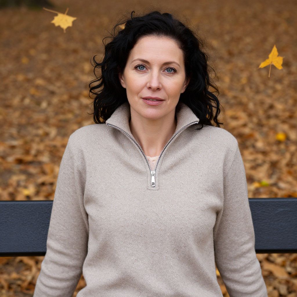 A natural daylight snapshot of a middle-aged woman with wavy dark hair and kind blue eyes wearing a classic half zip sweater in earthy beige, sitting on a park bench in autumn, golden leaves falling around her, the half zip gently opening to show a subtle pattern of small dots.