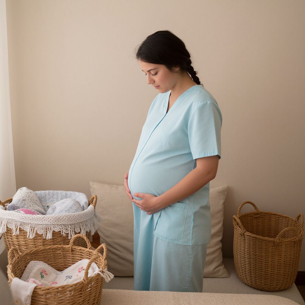 Photograph of a pregnant woman with dark hair in a side braid, standing in a softly lit room. She wears light blue medical scrubs and gently touches her large, rounded belly with both hands. In the background, beige pillows rest against a plain wall. In the foreground, two wicker baskets contain white, lace-trimmed cloths and a small, floral embroidered piece. The overall color palette is soft and neutral, with a warm, calming ambiance. The woman's expression is serene and contemplative.