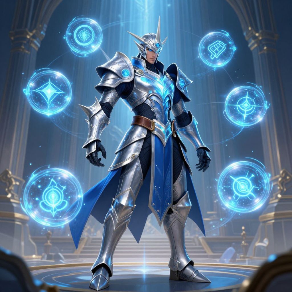 This digital CGI image depicts a powerful, armored warrior standing on a glowing circular platform in a grand, illuminated hall with tall, arched windows. The warrior, wearing silver and blue metallic armor with intricate designs, has a blue emblem on his chest and a horned helmet. Six floating, glowing blue magical orbs, each containing various runes, encircle his head. The armor is detailed with sharp edges and a flowing blue cape. The background features elegant, golden architectural details and soft, blue light beams streaming from above. The warrior's stance is strong and commanding, exuding an aura of magical prowess and authority.