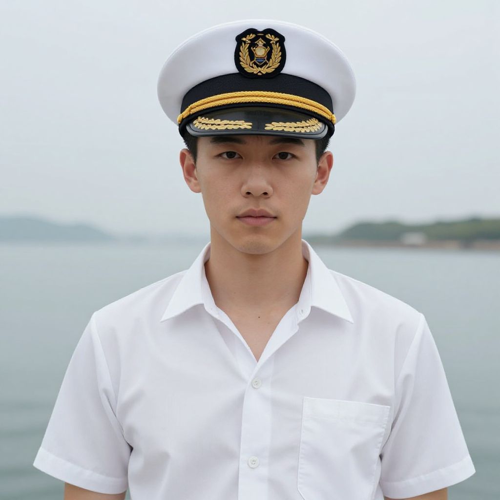 Photograph of a young Asian male with light skin and short black hair, standing in front of a blurred, overcast seascape. He wears a white naval captain's hat with a black visor and gold trim, and a crisp white short-sleeved shirt. His expression is neutral, and he looks directly at the camera. The hat's emblem is centrally positioned on the front. The background features a calm, grey-blue sea with a faint, distant shoreline. The overall image is sharp, with a slight vignette effect around the edges, emphasizing the subject.