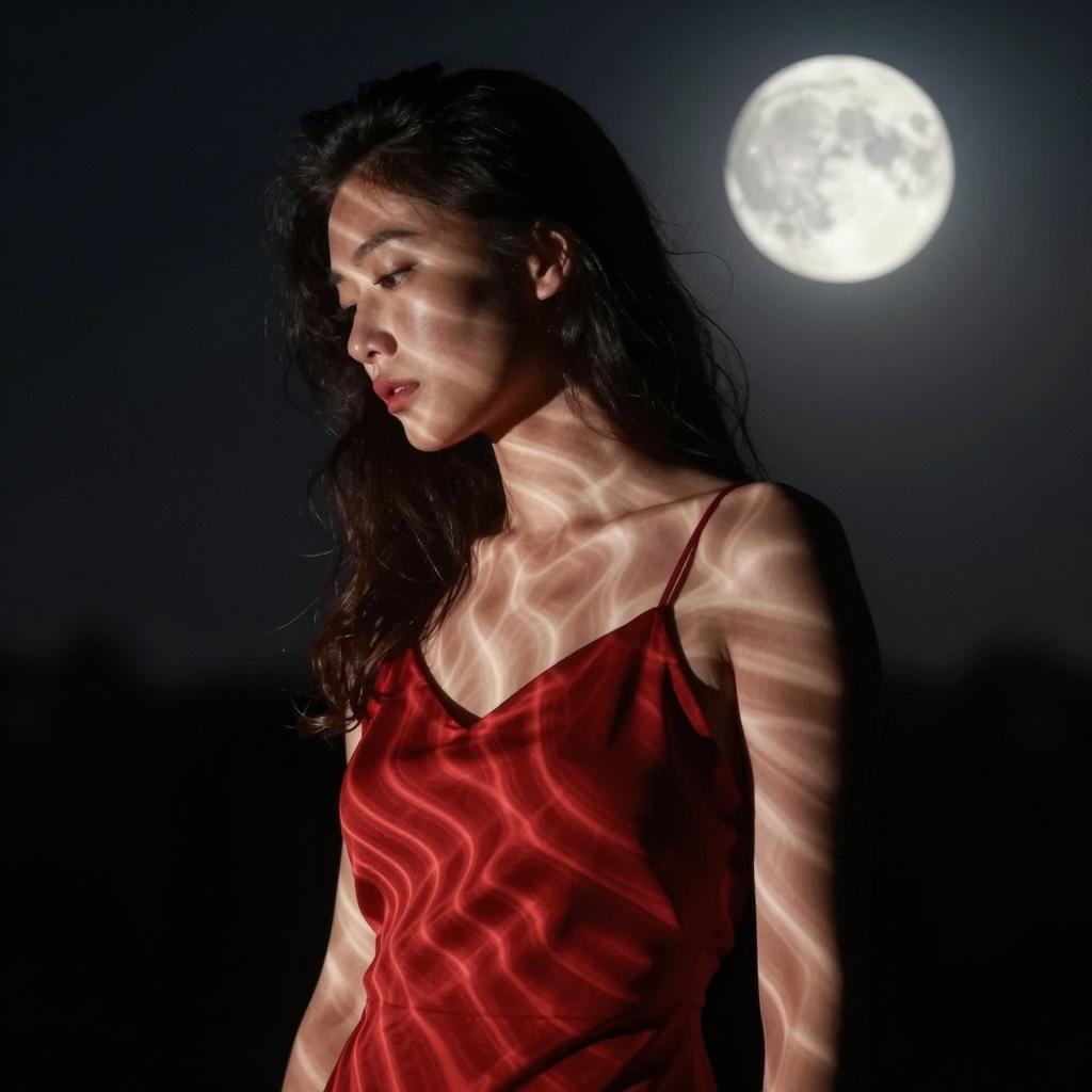 Photograph of a topless woman with red, wavy light patterns creating a hypnotic effect across her body. She's in profile, facing left, with her head slightly downcast. The lighting is dramatic, casting strong shadows and highlights. A full moon is visible in the top right corner, slightly out of focus. The background is dark and blurred, keeping the focus on the woman's illuminated form. The camera angle is slightly below eye level, adding depth.