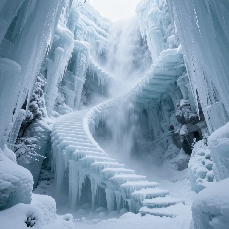 A mesmerizing cascade of ice forms an endless, crystalline staircase that defies gravity, spiraling infinitely into a frosty abyss where reality blurs between stillness and perpetual motion.