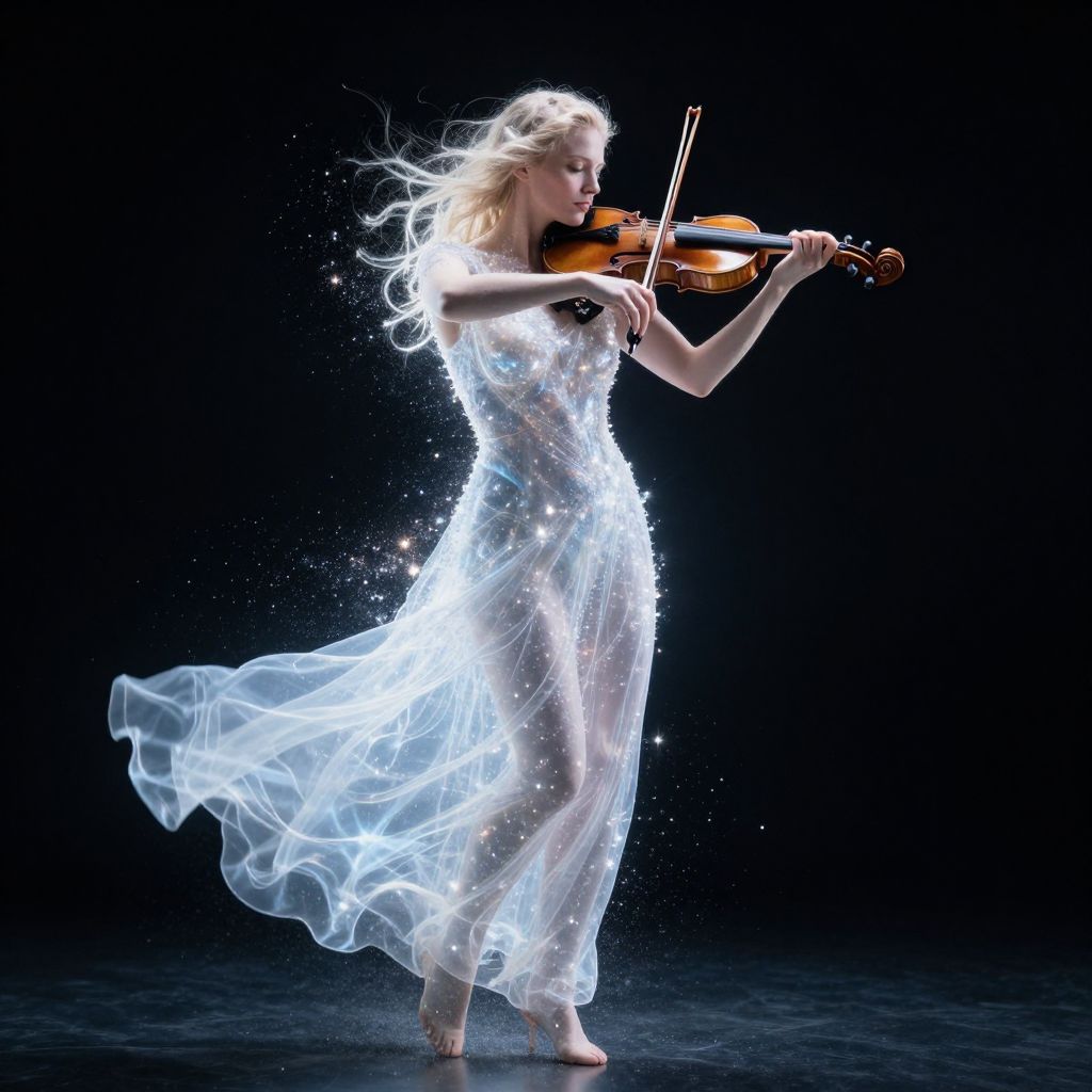 A spectral figure cloaked in ethereal light plays a violin, conjuring a luminous, translucent woman who floats gracefully in the air, her form dissolving into sparkling particles as she dances.