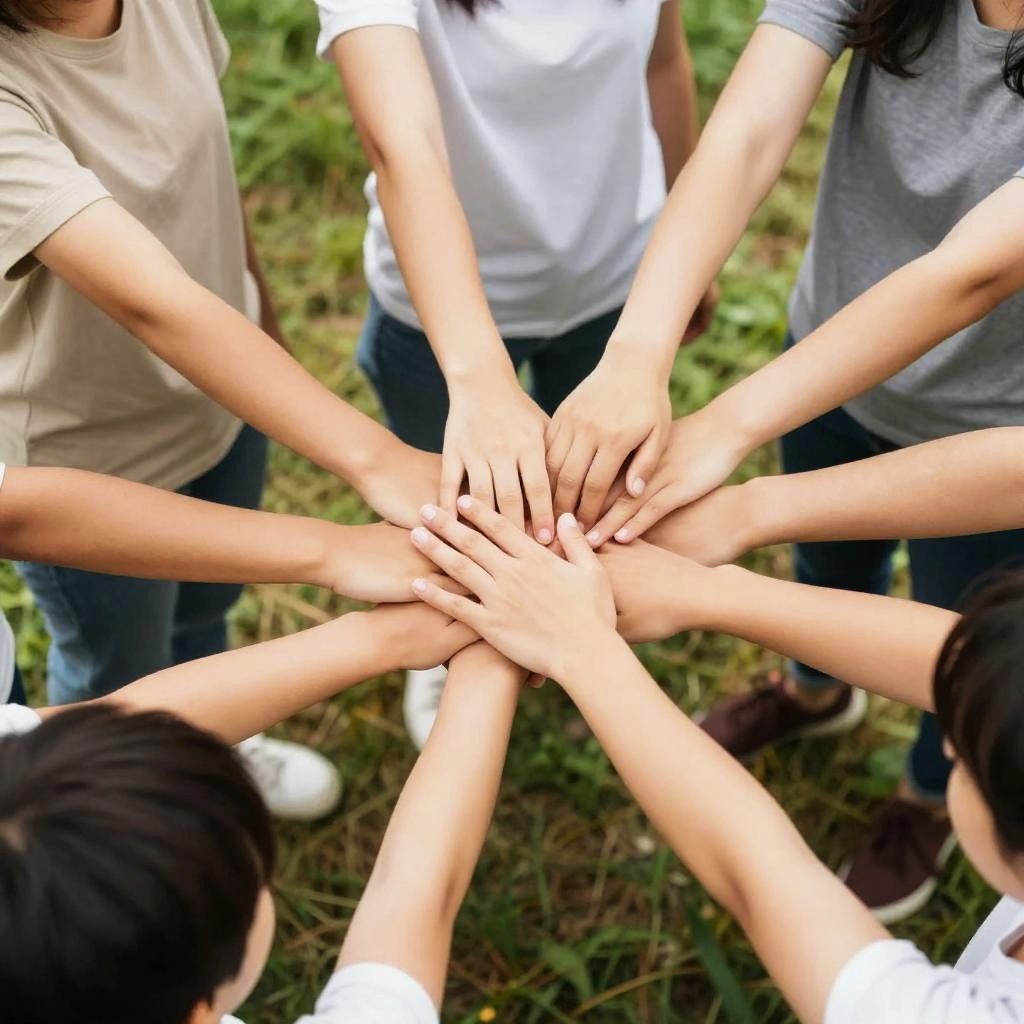 Group of diverse people putting their hands together in a teamwork gesture outdoors on green grass, warm natural light, casual clothing, soft focus capturing a candid moment, natural color scheme with green and beige tones