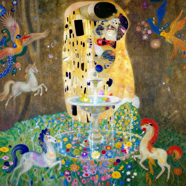 Create an elaborate digital artwork in the manner of Gustav Klimt's style, portraying a whimsical garden setting where mythical creatures playfully interact with luminous, impressionistic flowers. From an elevated perspective, observe magical beings like unicorns and phoenixes gracefully weaving through the flora, generating a surreal yet dreamy ambiance. The focal point is an otherworldly fountain, its glistening water reflecting the brilliant colors of surrounding blossoms, which are embellished with gold leaf designs reminiscent of Klimt's signature motifs. This mesmerizing image should evoke both fascination and longing, celebrating the harmony between nature and magical elements.