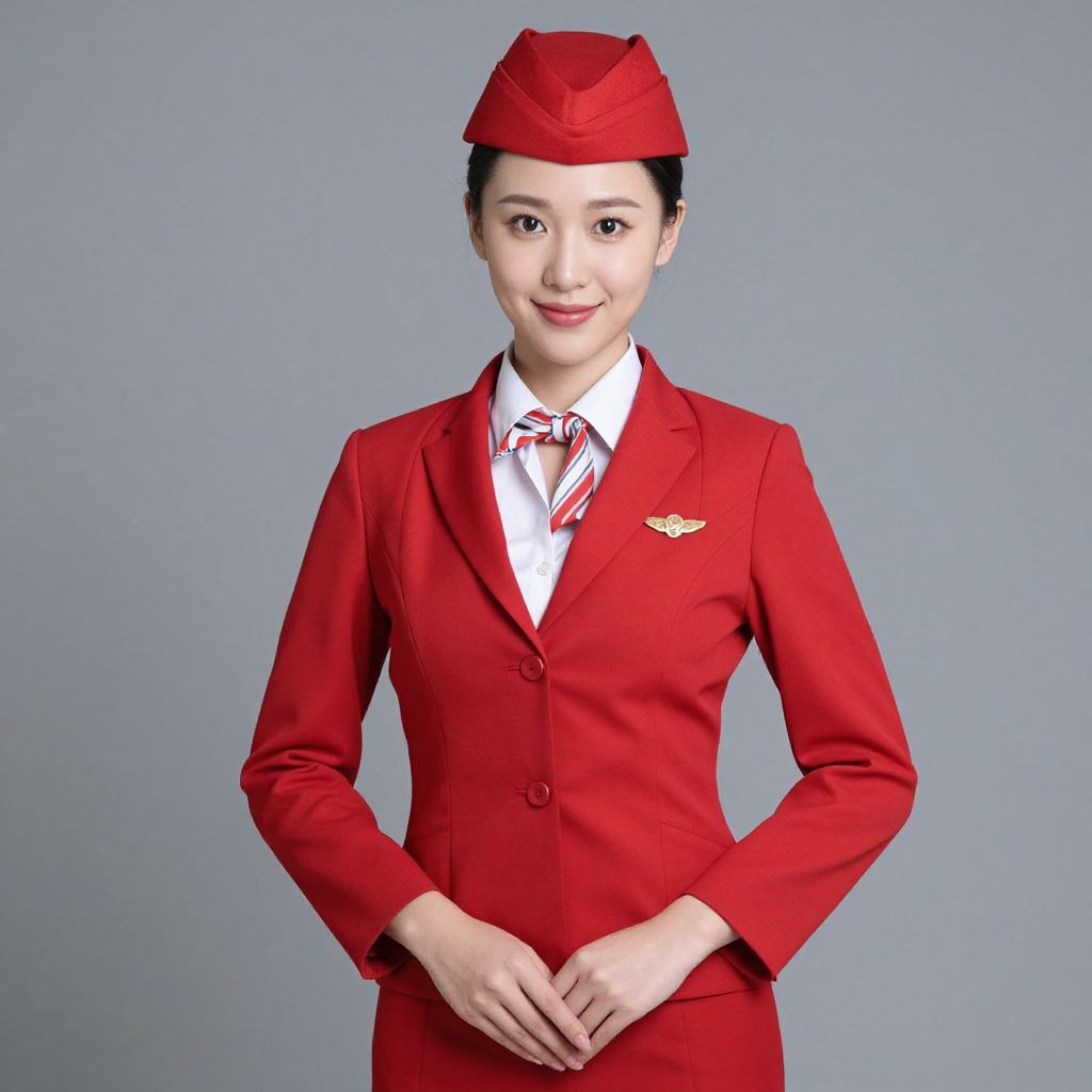 Air Hostess Fancy Costume, woman in red uniform with a red hat and red jacket