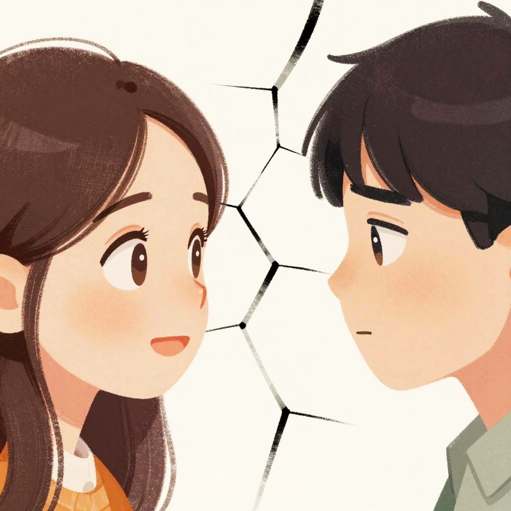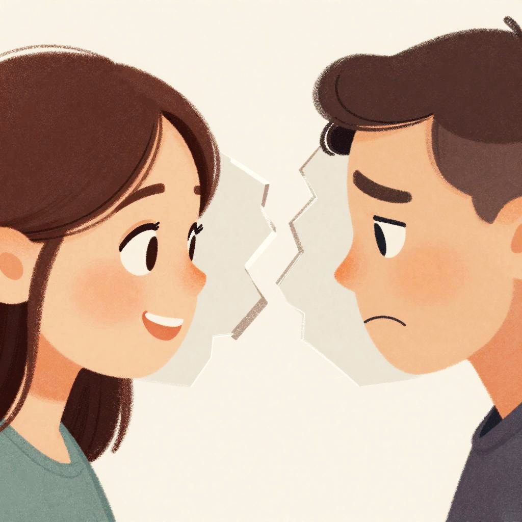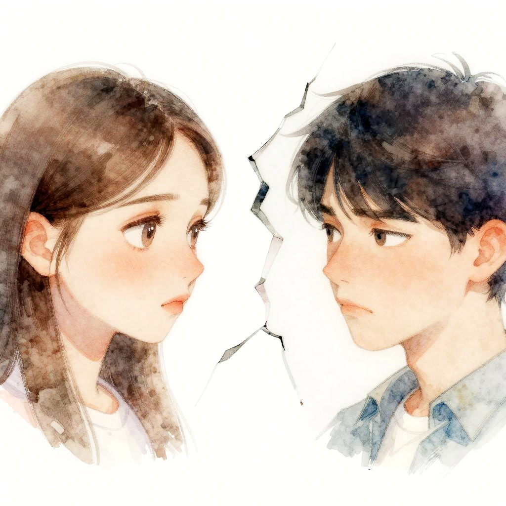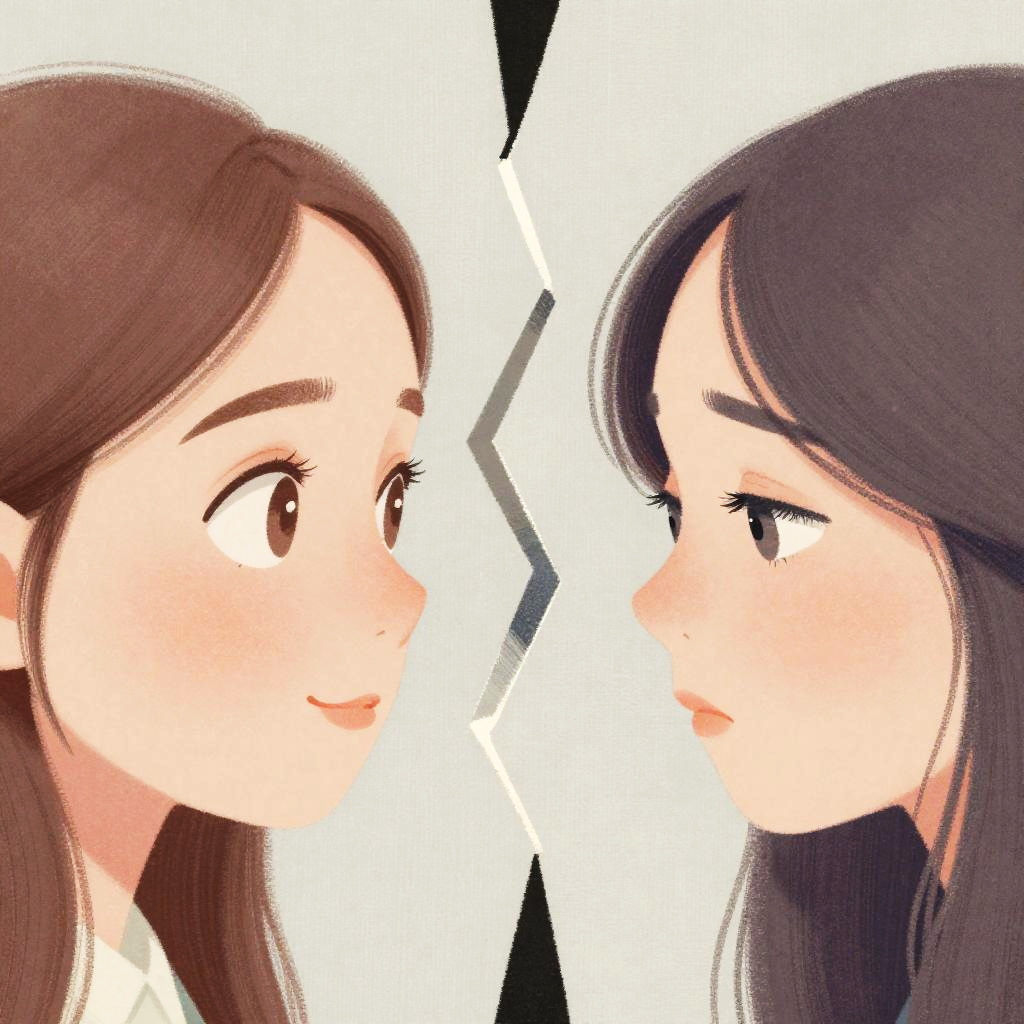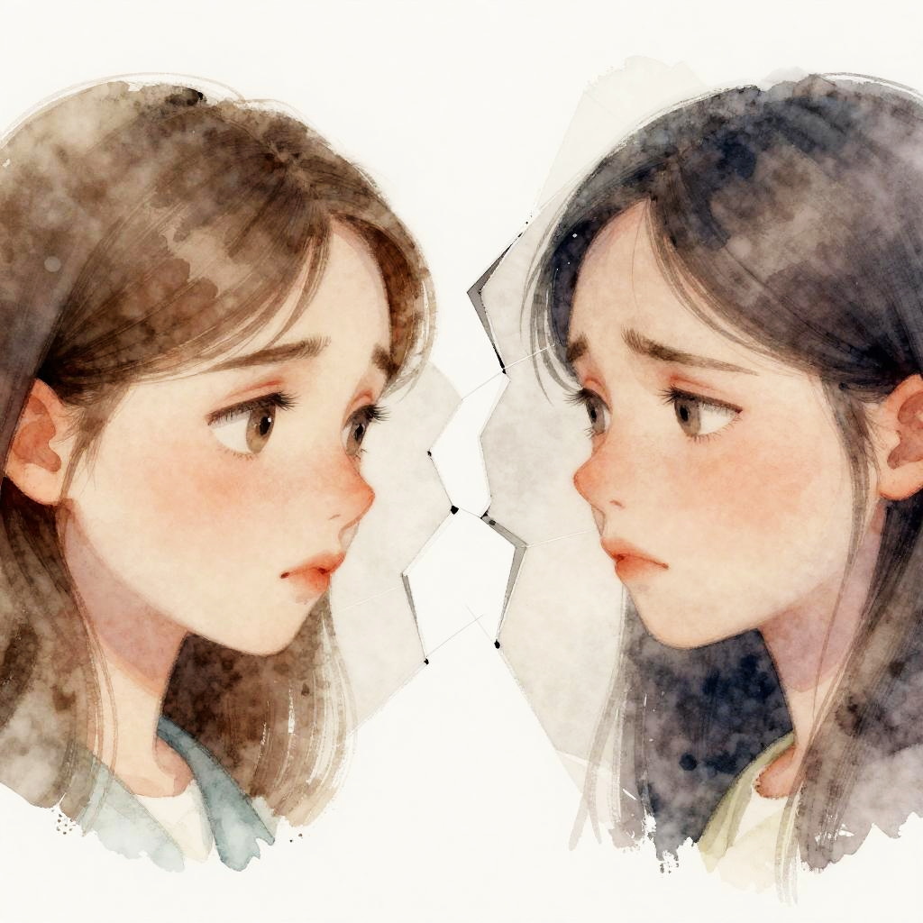 An illustration featuring two faces on opposite sides of a fractured border, each expressing contrasting emotions—one with a confident, focused expression and the other with an anxious, uneasy gaze. Rendered in pastel shades with a subtle watercolor texture that enhances the emotional depth. The fractured border symbolizes separation, while the soft hues create a delicate, introspective atmosphere, balancing harmony and tension within the composition.