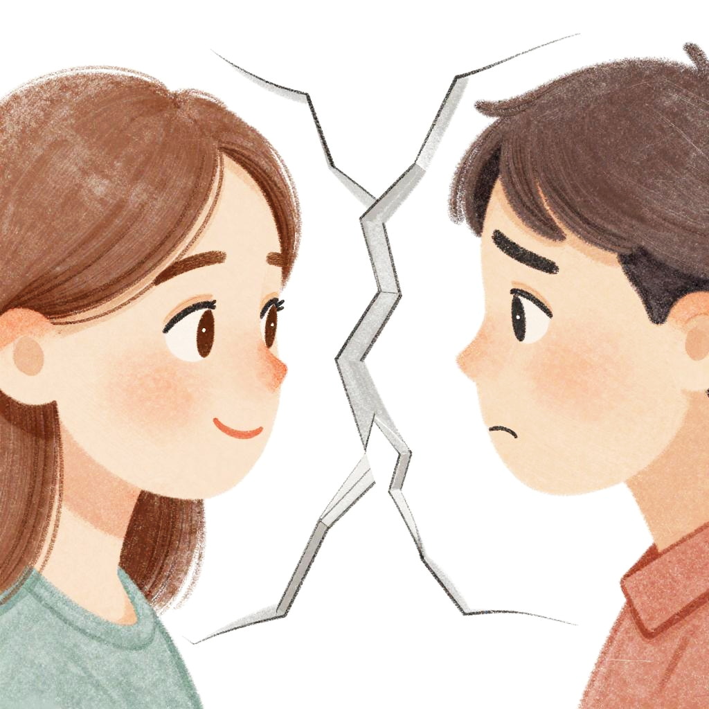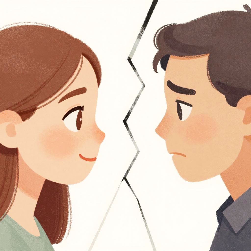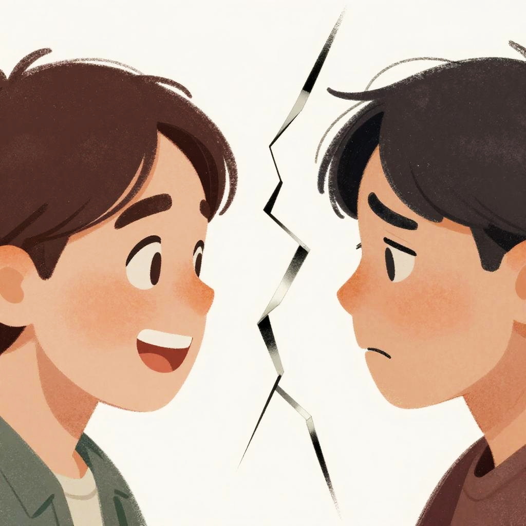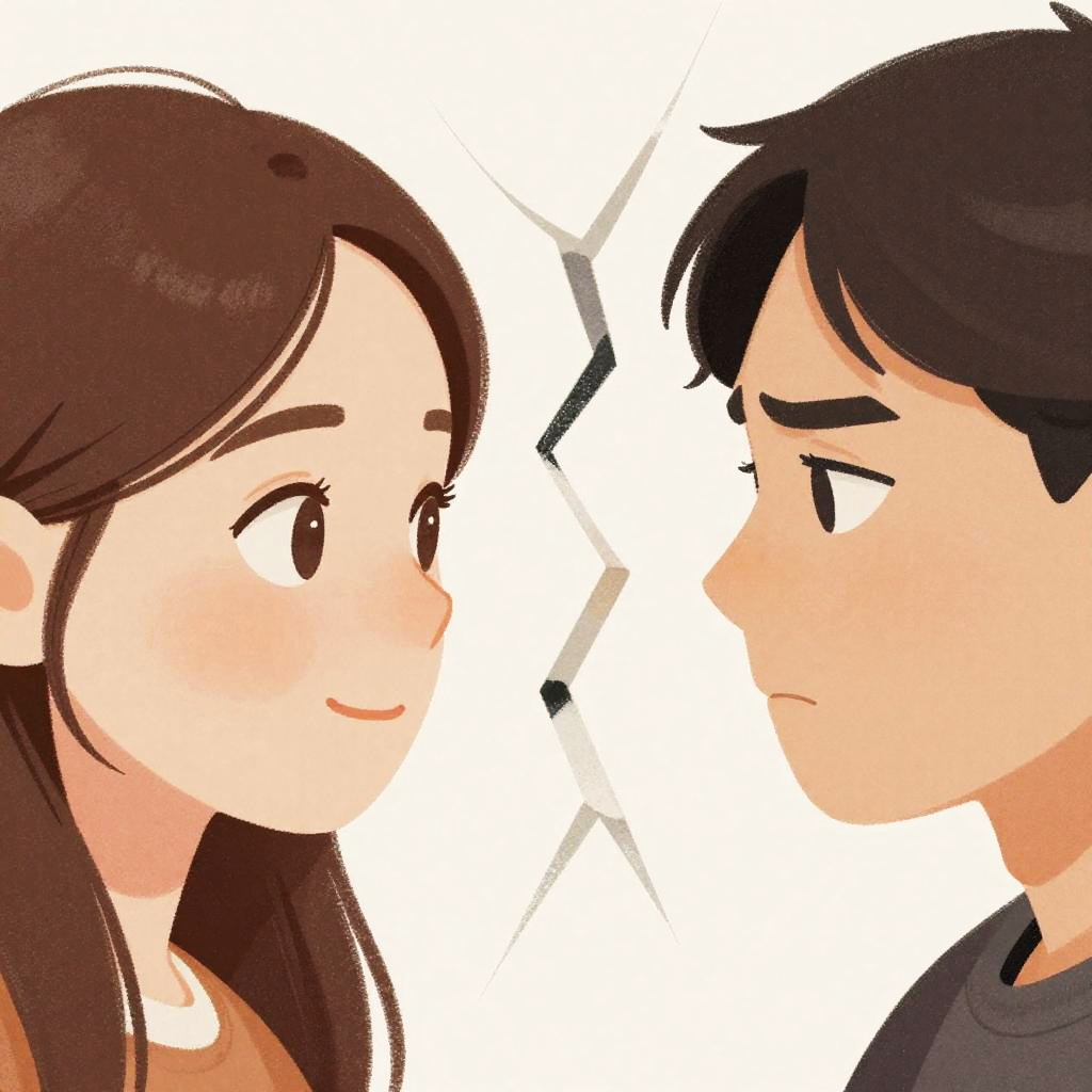 An illustration featuring two faces on opposite sides of a fractured border, each expressing contrasting emotions—one with a confident, focused expression and the other with an anxious, uneasy gaze. Rendered in pastel shades with a subtle watercolor texture that enhances the emotional depth. The fractured border symbolizes separation, while the soft hues create a delicate, introspective atmosphere, balancing harmony and tension within the composition.