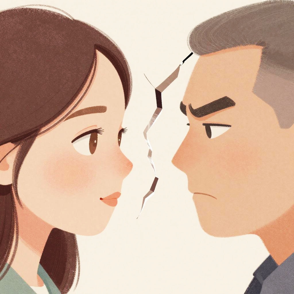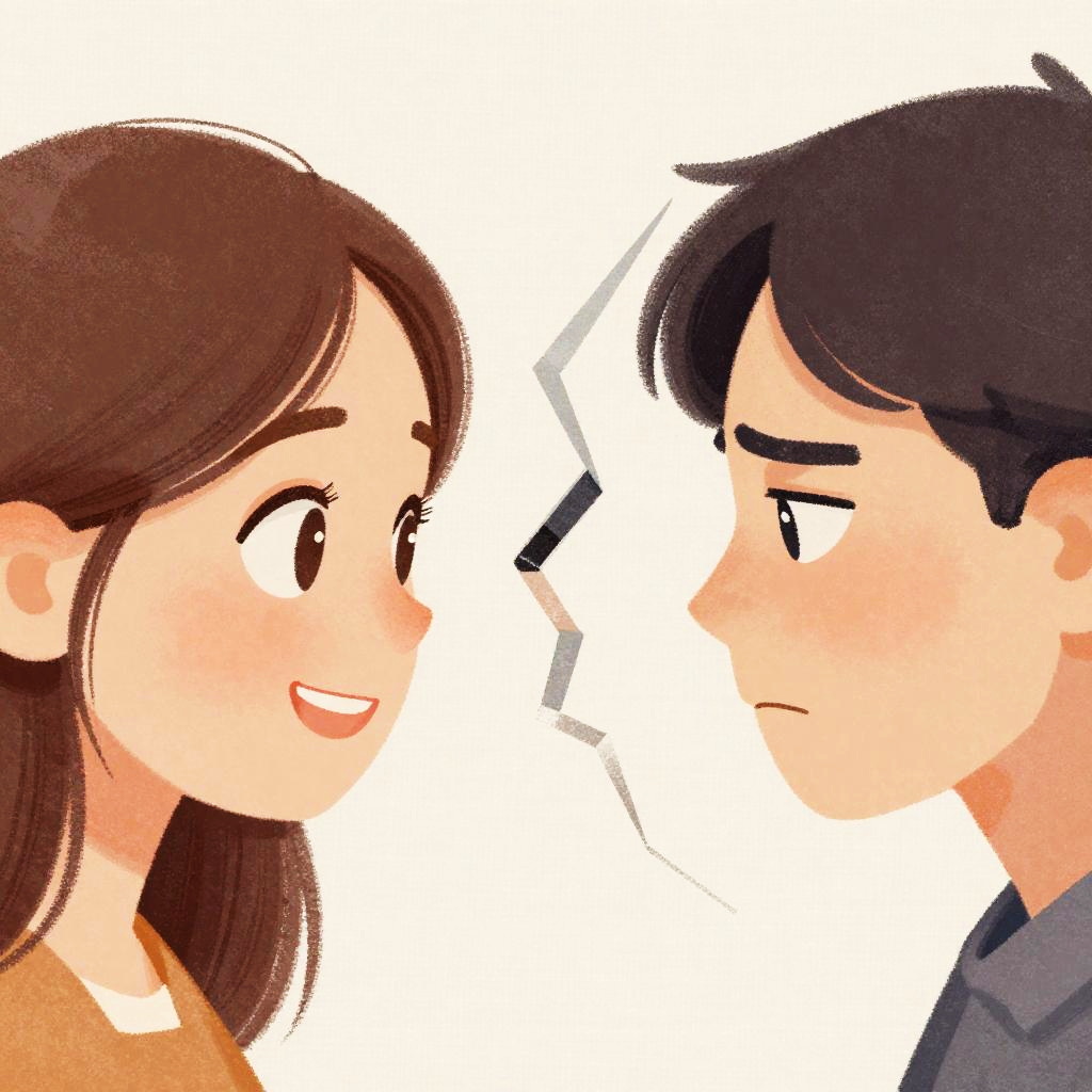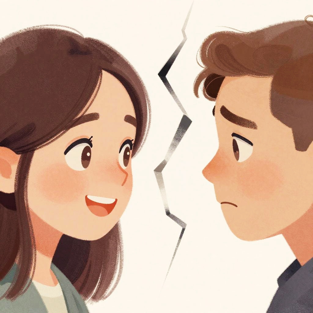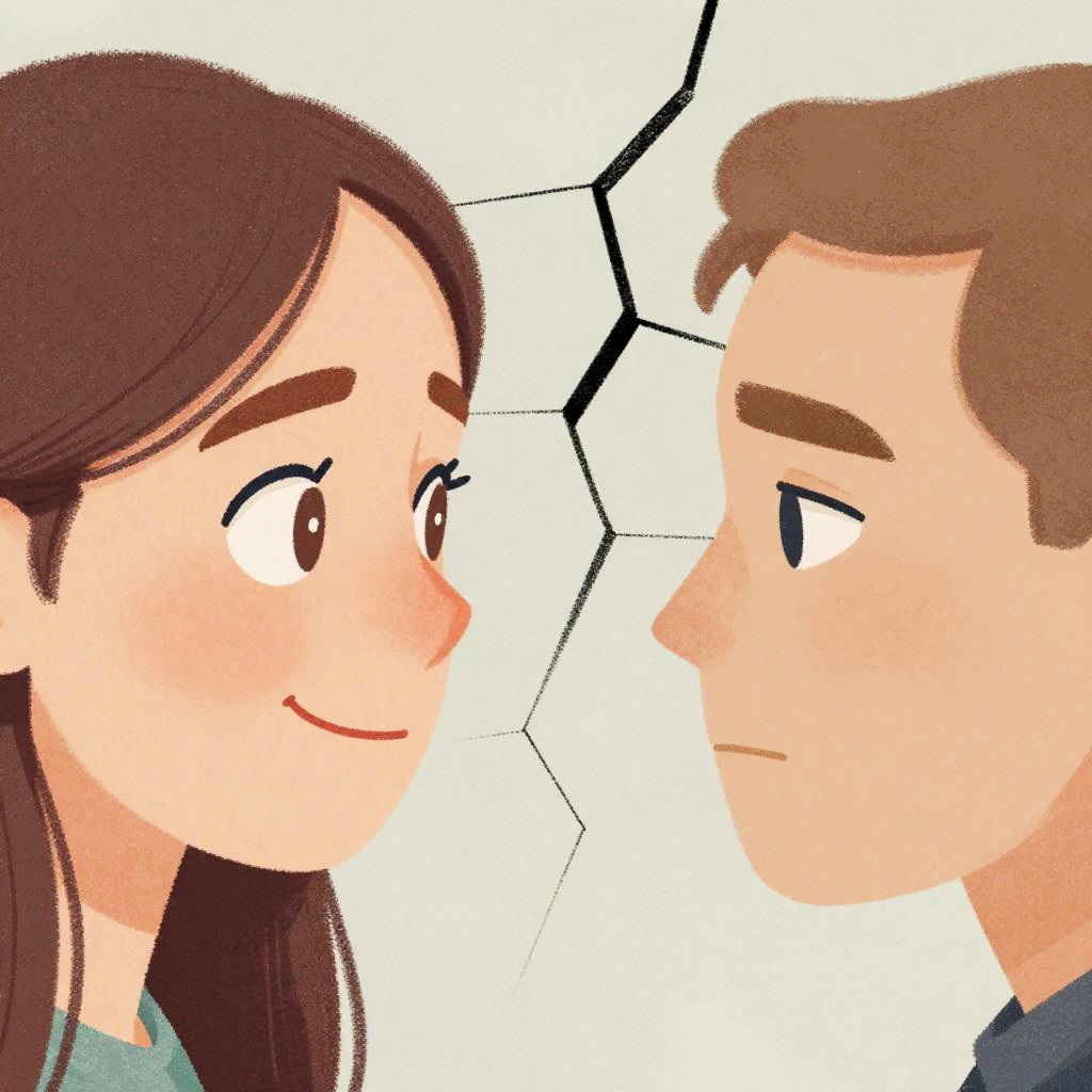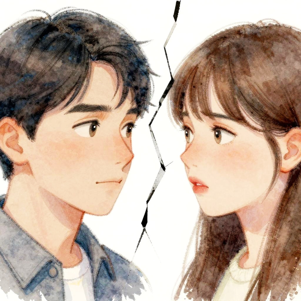 An illustration featuring two faces on opposite sides of a fractured border, each expressing contrasting emotions—one with a confident, focused expression and the other with an anxious, uneasy gaze. Rendered in pastel shades with a subtle watercolor texture that enhances the emotional depth. The fractured border symbolizes separation, while the soft hues create a delicate, introspective atmosphere, balancing harmony and tension within the composition.