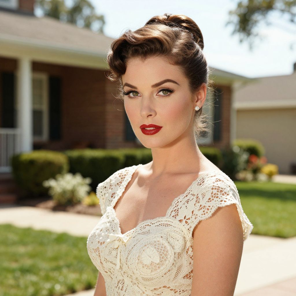 A high-definition, retro-inspired portrait featuring a woman with vintage styling, including a classic updo hairstyle and a lace-adorned dress, set against a sunlit suburban backdrop with a brick house and vibrant greenery, evoking the timeless elegance reminiscent of classic Hollywood glamour.