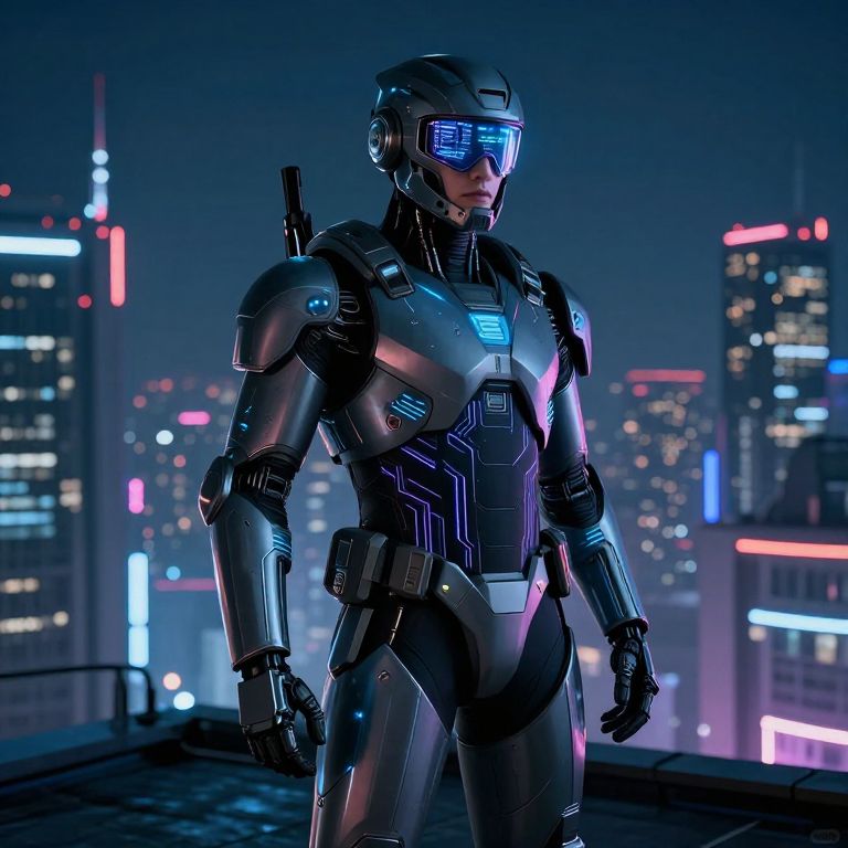 Fidelis represented as a futuristic cybernetic soldier in a neon-lit cityscape at night, sleek armor with glowing circuits, visor reflecting digital data, standing confidently on a rooftop overlooking the sprawling metropolis, embodying fidelity and resilience.