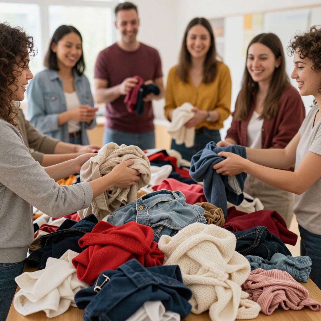 Photograph of six young adults, three women and three men, smiling and sorting through a pile of colorful clothes. The clothes include jeans, sweaters, and shirts in red, white, blue, and beige. The people have diverse appearances: curly brown hair, straight brown hair, and straight black hair. They are wearing casual clothes like jackets and t-shirts. The background is brightly lit with a blurred, white interior. The group is engaged in a collaborative activity, holding clothes and looking at each other, creating a friendly and communal atmosphere.
