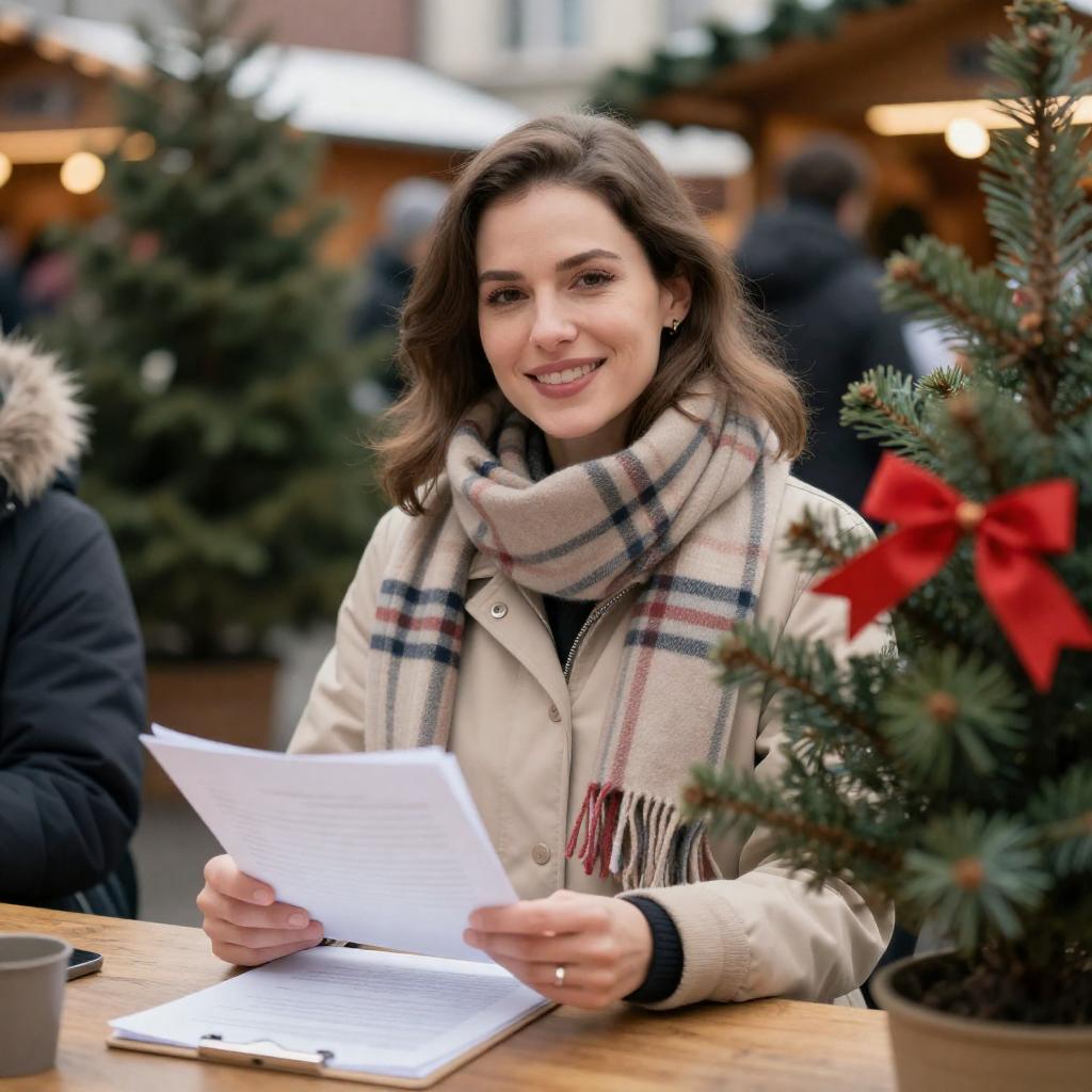 Photograph of a smiling woman with light brown hair, wearing a green parka with a white fur hood, holding a white envelope. She stands in a festive outdoor market with blurred background figures, decorated Christmas trees, and wrapped gifts.