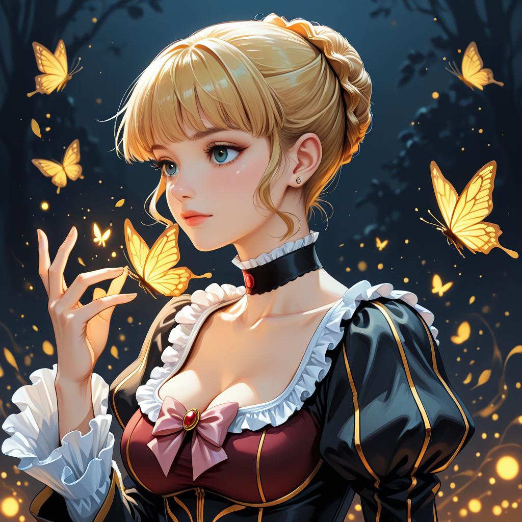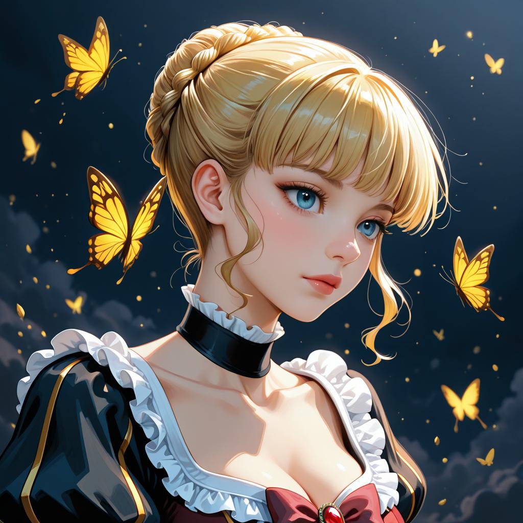 Digital illustration of an anime-style young woman with blonde braided hair, blue eyes, and pale skin. She is wearing a black dress with white frills and a black choker, surrounded by glowing yellow butterflies against a dark, cloudy night sky.