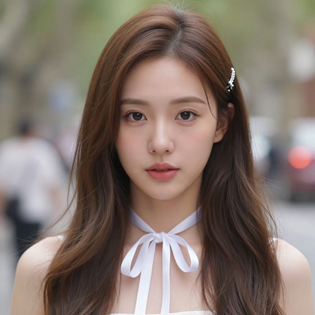 Asian girl with long black hair and a pink flower in her hair. She is wearing a pink dress with a pink collar and a pair of earrings. The background is a red building with gold trim.