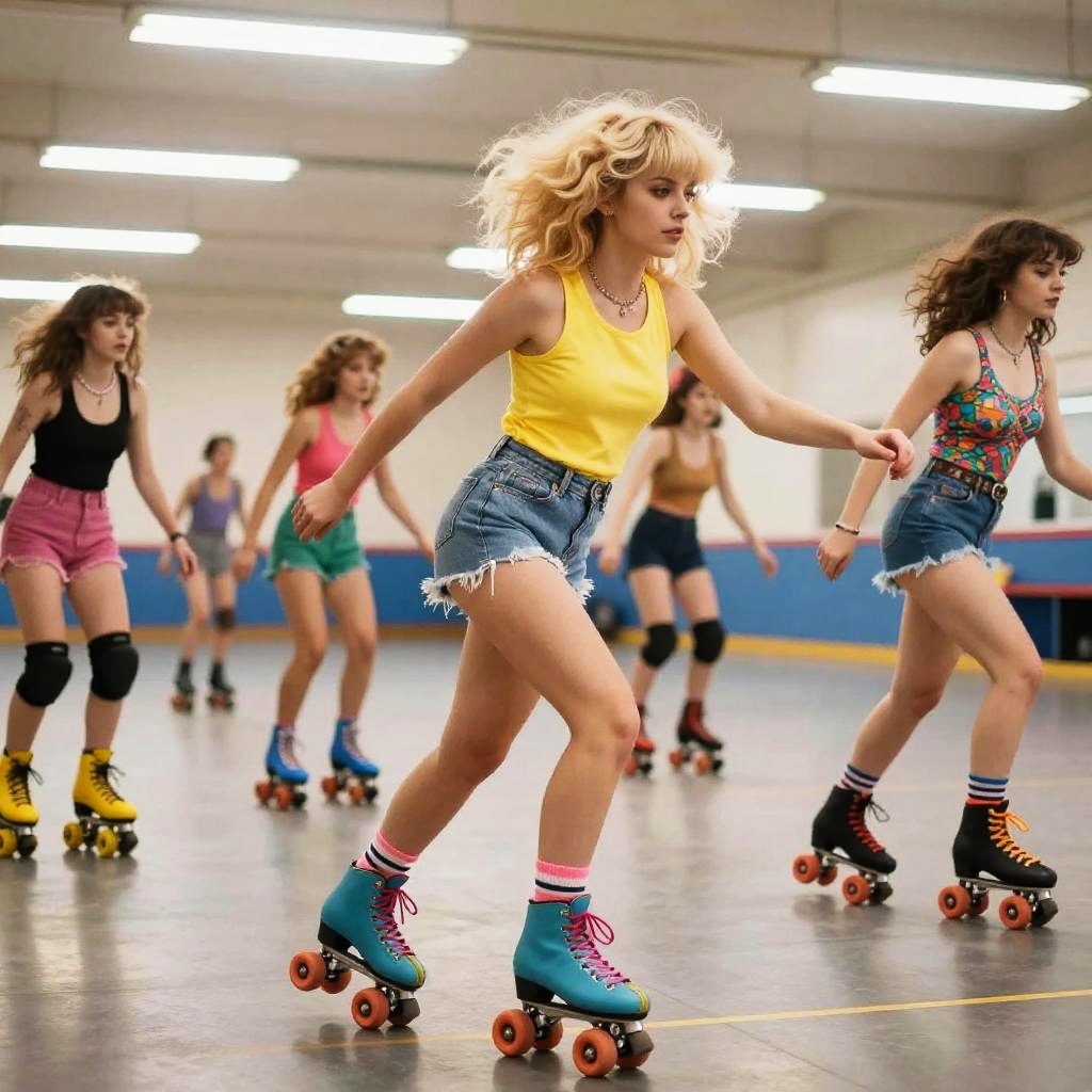 Dynamic scene featuring 80s style bangs in an outdoor roller rink, fluorescent lights, people skating with retro outfits, big teased hair with layered bangs, energetic and colorful