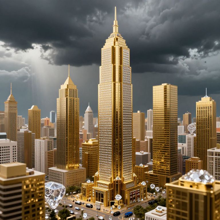 Materialism depicted as a surreal cityscape filled with towering skyscrapers made of gold, diamonds, and electronic gadgets, under a stormy sky, highlighting the obsession with wealth and possessions in a futuristic dystopian style.