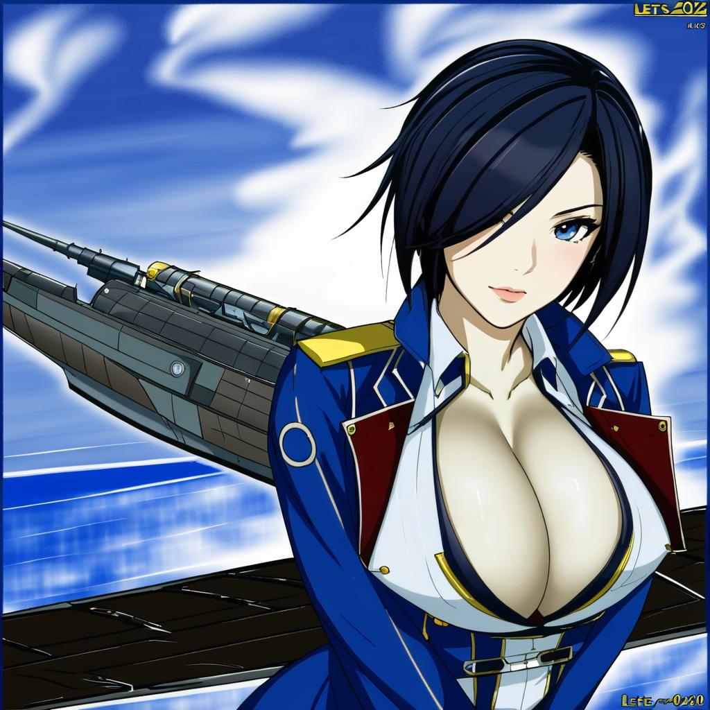 Ark royal (azur lane), azur lane, 1girl, blue eyes, hair over one eye, black hair, short hair, large breasts, cleavage, by artist tomato rice, anime