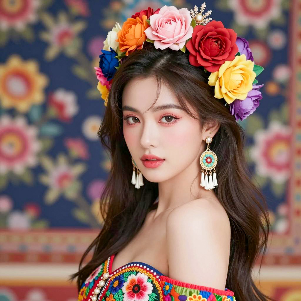 Photograph of a woman with fair skin, dark hair in an elaborate flower crown, wearing a colorful, embroidered traditional dress, large pink bead earrings, and red lipstick. Bright, colorful floral background. She looks directly at the camera with a neutral expression.