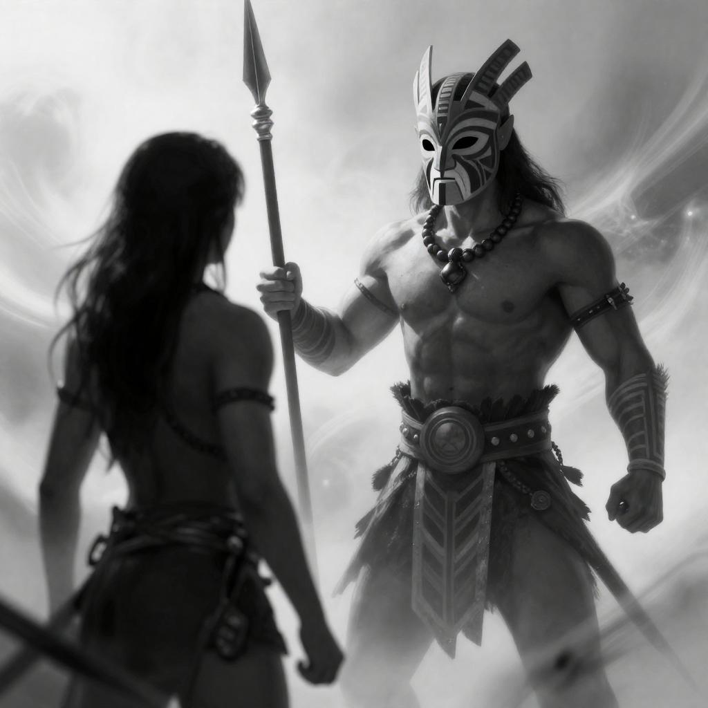 Black-and-white digital drawing of a muscular, shirtless warrior with a tribal mask, holding a spear, facing a silhouetted figure with long hair. The warrior wears a loincloth and has a necklace. The background is dynamic with bright, swirling light. The silhouetted figure's back is to the viewer, creating a sense of confrontation.