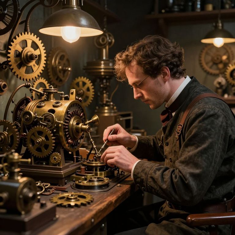 Photograph of a Caucasian man with curly brown hair and glasses, dressed in a dark, textured Victorian-style suit, tinkering with intricate brass gears and machinery under a warm, industrial lamp. The background features more mechanical gears and dimly lit shelves. The man's focused expression and precise hand movements suggest careful craftsmanship. The image's rich, warm tones and detailed textures evoke a steampunk aesthetic. The lighting highlights the metallic surfaces, creating a nostalgic, vintage atmosphere.