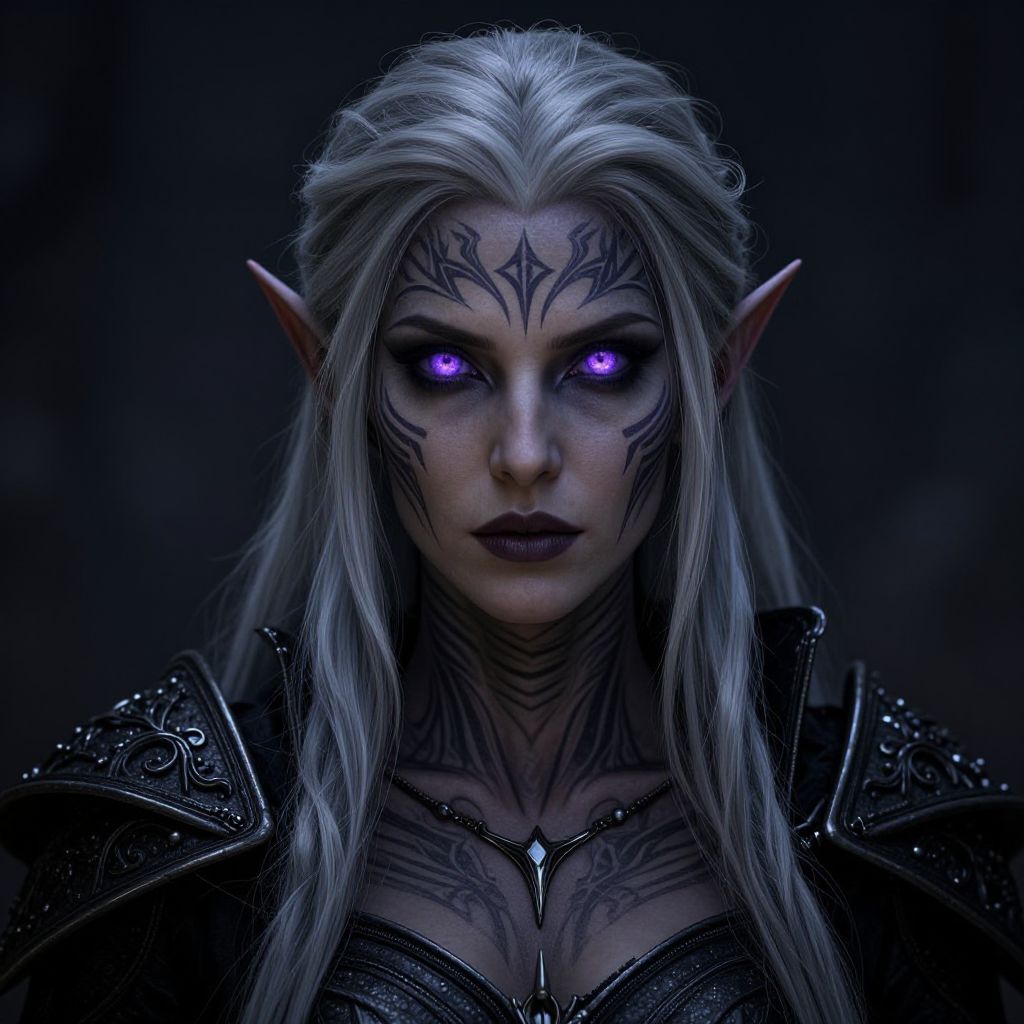 D&D female drow portrait, dark elven woman with silver hair, glowing violet eyes, intricate tribal face tattoos, wearing gothic armor, fantasy art, highly detailed, moody lighting