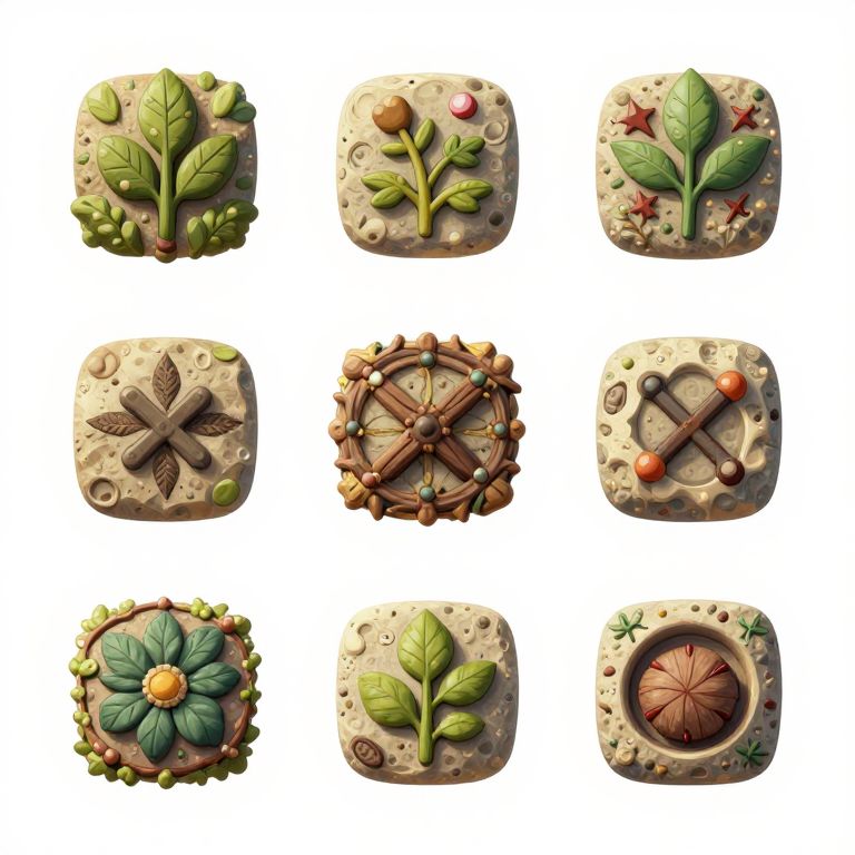 Beach material game concept, 5x5 symbol , magic craft, fantasy style, cel-shading , icon , Herbals , craft resource , ghibi color , white background, 4k,