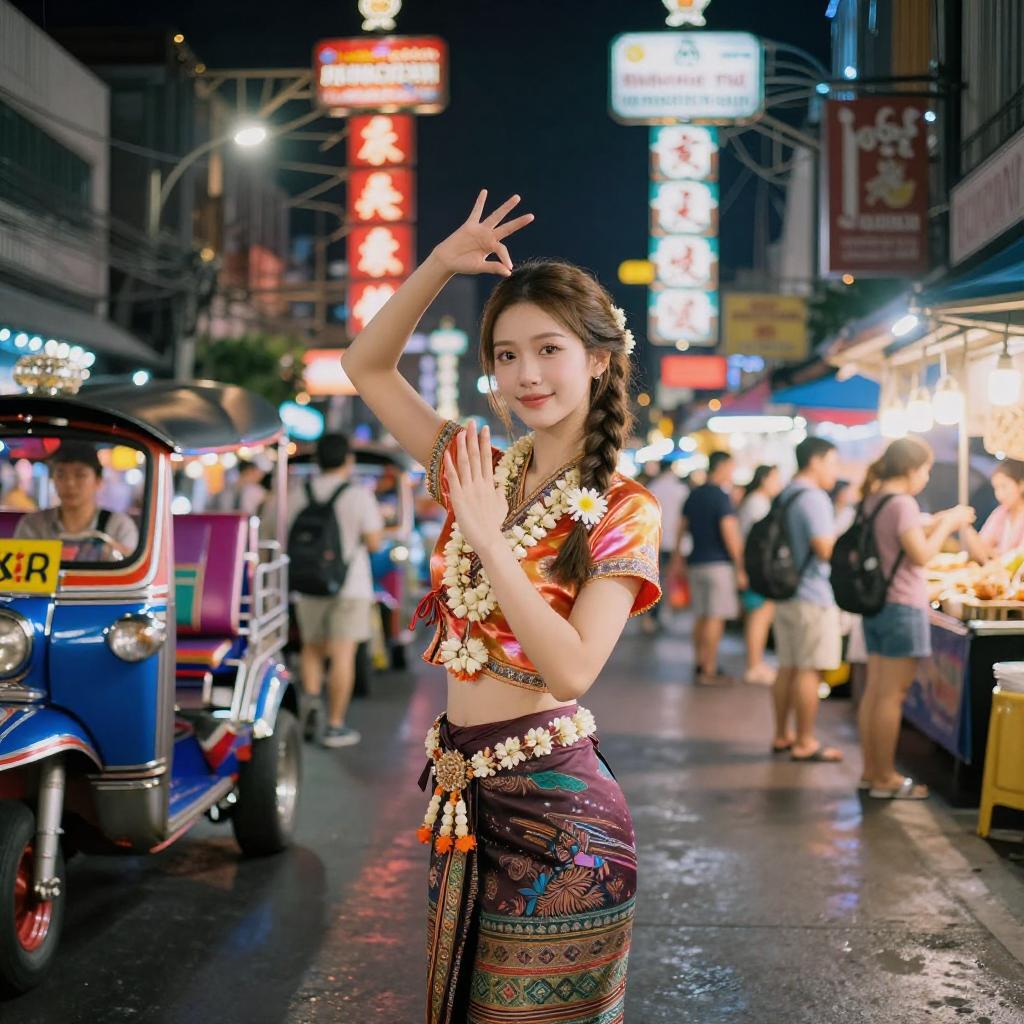 (8k, RAW photo, best quality, masterpiece:1.2), (realistic, photo-realistic:1.37), 1girl, graceful Thai dancer with braided hair, wearing a vibrant silk blouse and patterned skirt, adorned with fresh jasmine garlands, whole body, delicate face, soft smile, cute:1.2, neon-lit Khao San Road, Bangkok — crowded backpacker night market with tuk-tuks, colorful Thai and English signboards, hanging fairy lights, packed street food stalls and narrow wet asphalt, early night, light fog and gentle breeze, professional lighting, rim light, photon mapping, radiosity, physically-based rendering, PBR, atmospheric perspective, front-facing, whole body, delicate face, soft smile, looking at viewer, five fingers, natural skin, minimal makeup, DSLR street photography, 35mm lens, shallow depth of field, film grain, high contrast, color graded, candid vibe, selfie pose